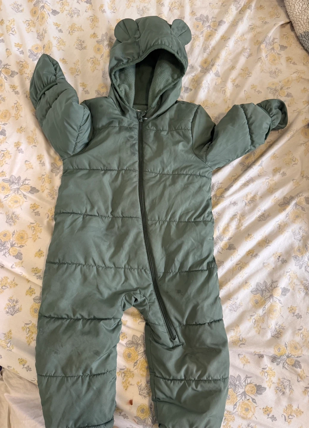42My kid has outgrown this snowsuit. Adorable and cozy Old Navy snowsuit in sage green, perfect for keeping your little one warm this winter! Features a soft fleece lining, full-length front zipper for easy dressing, fold-over cuffs to keep tiny hands and feet warm, and a cute hood with little bear ears 🐻. Gently used, excellent condition. From a smoke-free, pet-free home. Pickup at dufferin and king