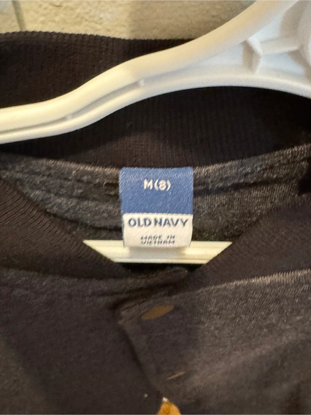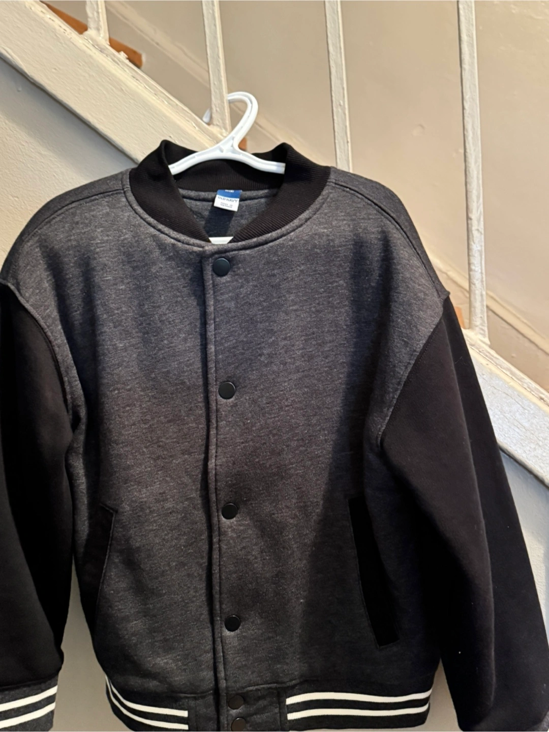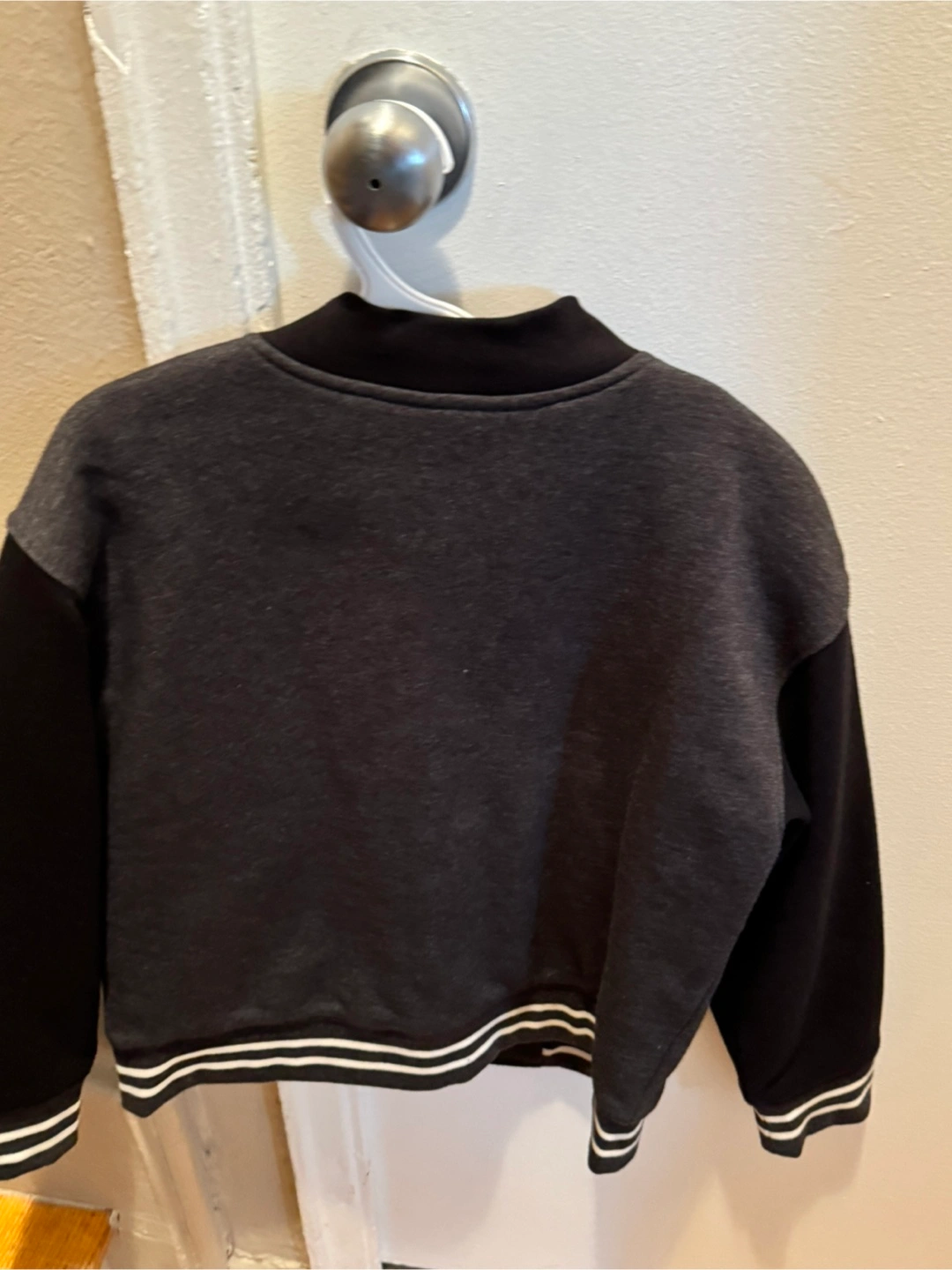 Grey and black bomber jacket. Size medium (8). Features ribbed cuffs and hem. Snap button closure. Great for layering.