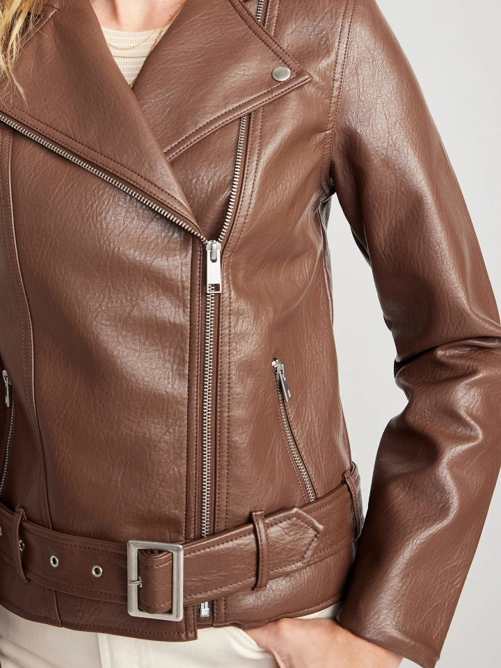 A brown faux leather jacket. Features a zipper closure. There are functional pockets on the front. Makes a great addition to an outfit for a lovely, relaxing day out. Never used, brand new.