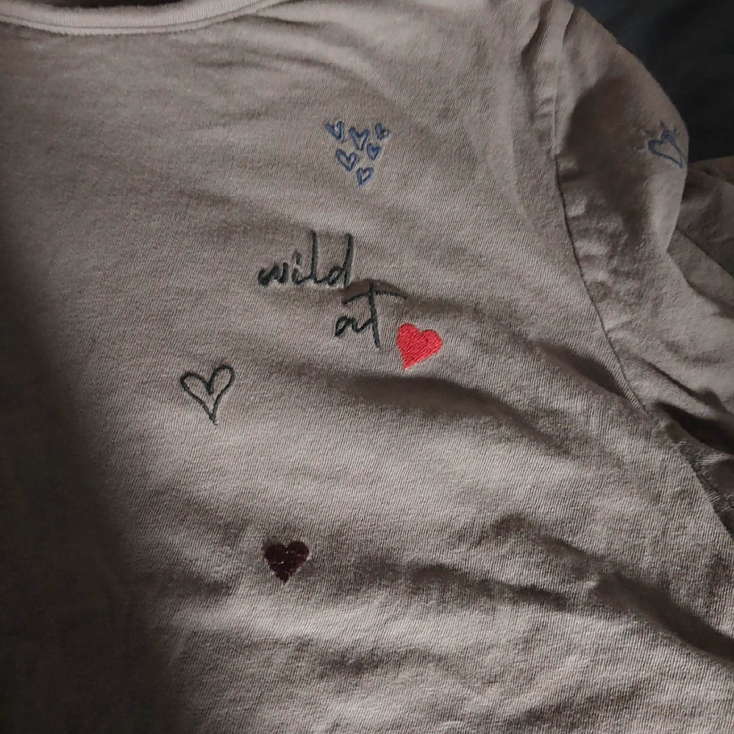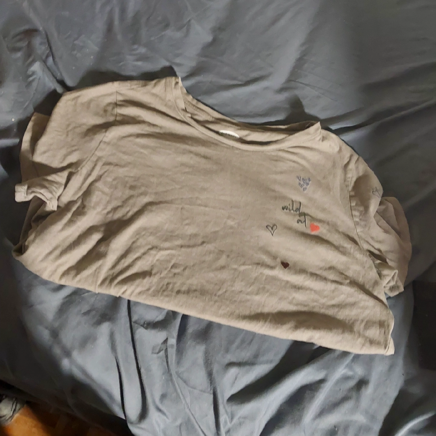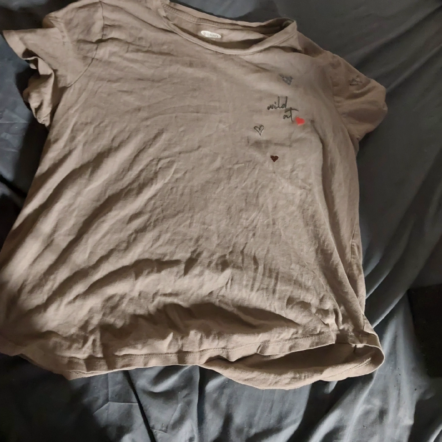 15Selling a gently used Old Navy Everywear tee in size large. It's a comfy short-sleeved shirt with cute heart details and the words 'wild at' embroidered on the front. Perfect for casual wear!