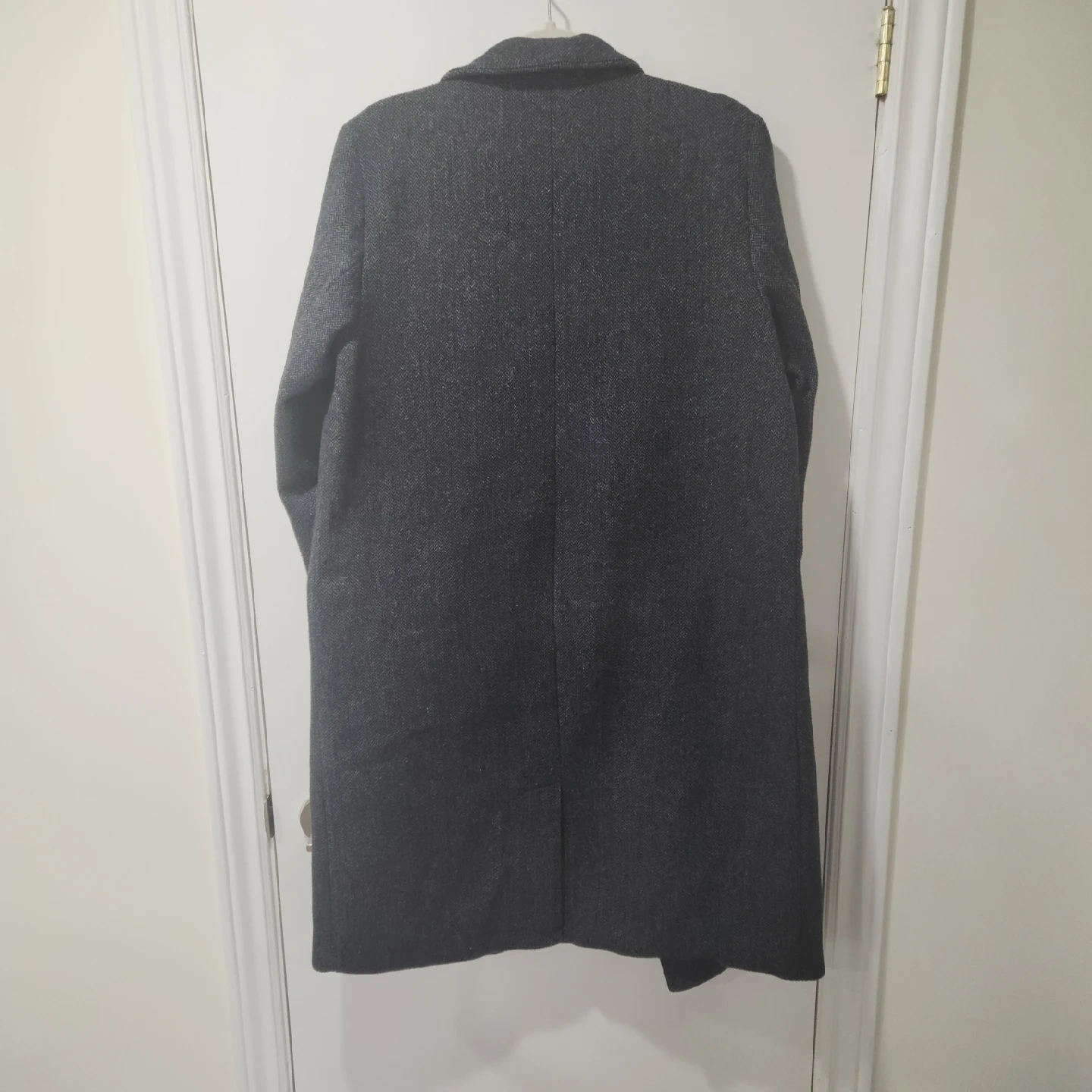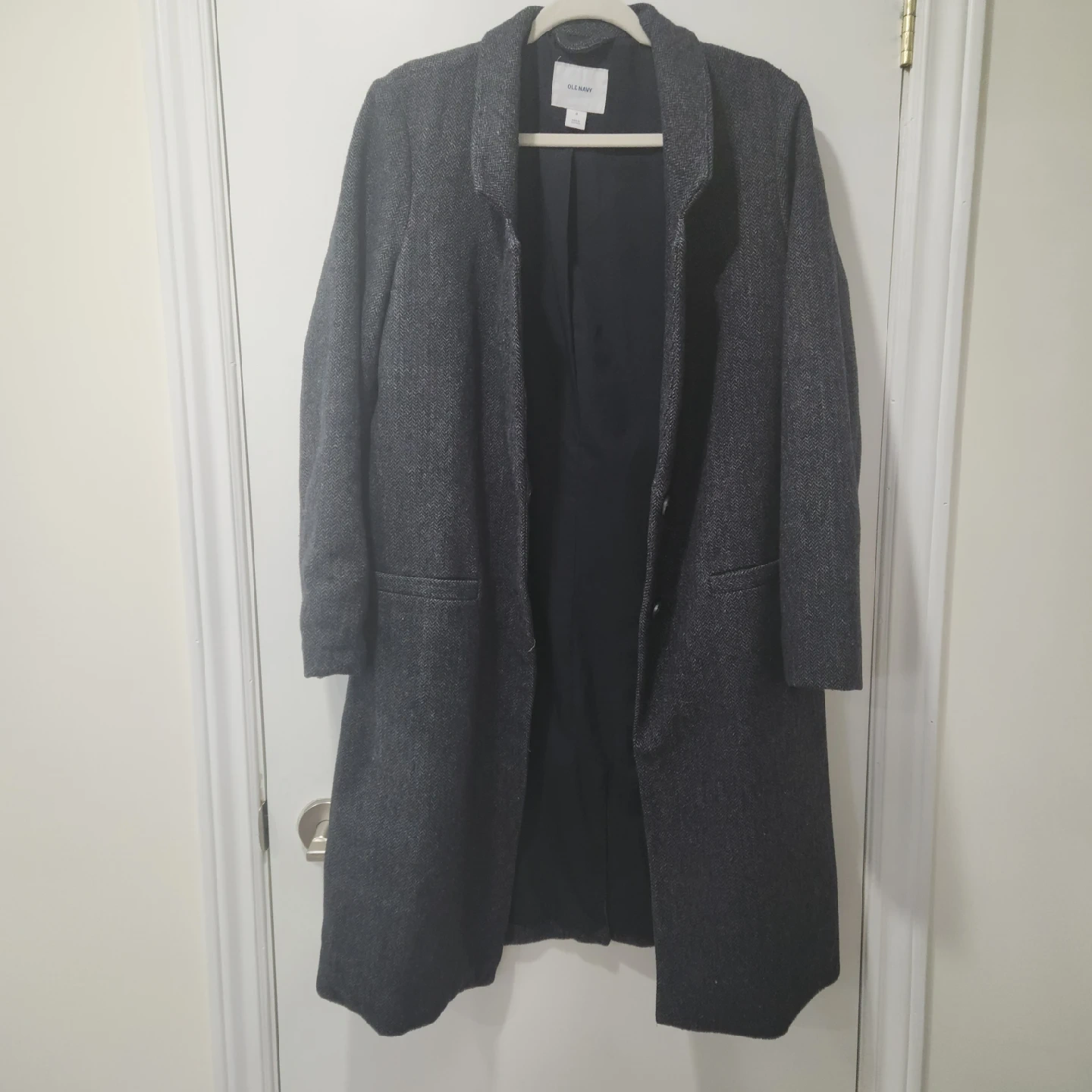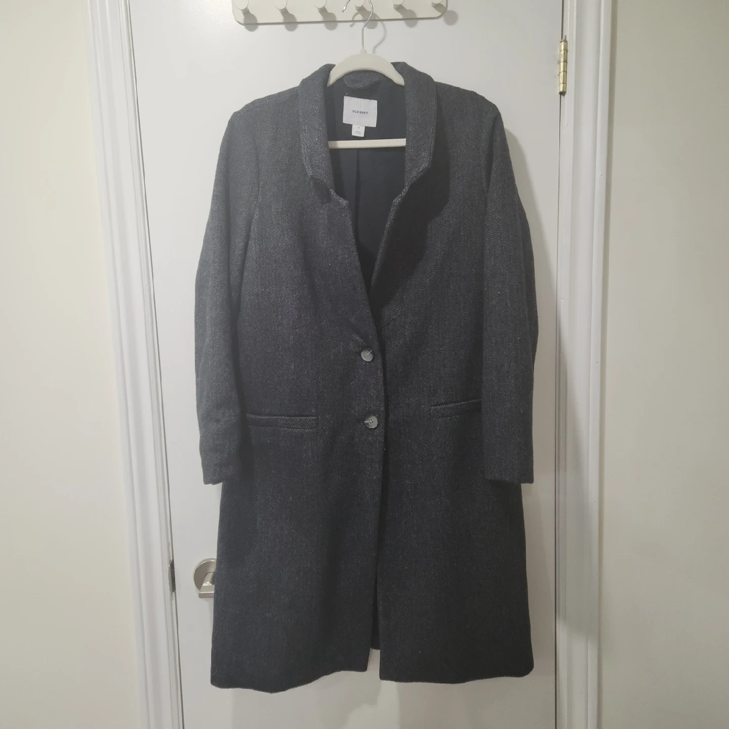 10Old Navy Grey Herringbone Wool Blend Coat Dark grey herringbone wool knit coat. 2 buttons in the front. Collared. Longer length hits around the knee. Non-functioning pocket detail in the front. Wool blend. Size M from Old Navy Pit to pit: 54cm, Length: 100cm