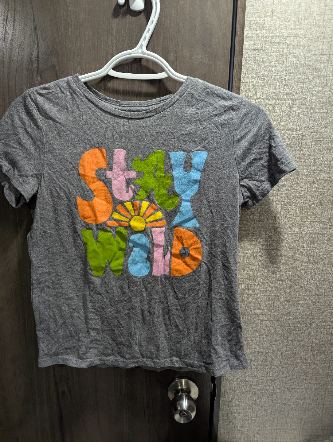 70Selling a cute Old Navy grey t-shirt in size XL (14-16). The shirt features a colourful 'Stay Wild' design. It's in great condition and ready for a new home!
