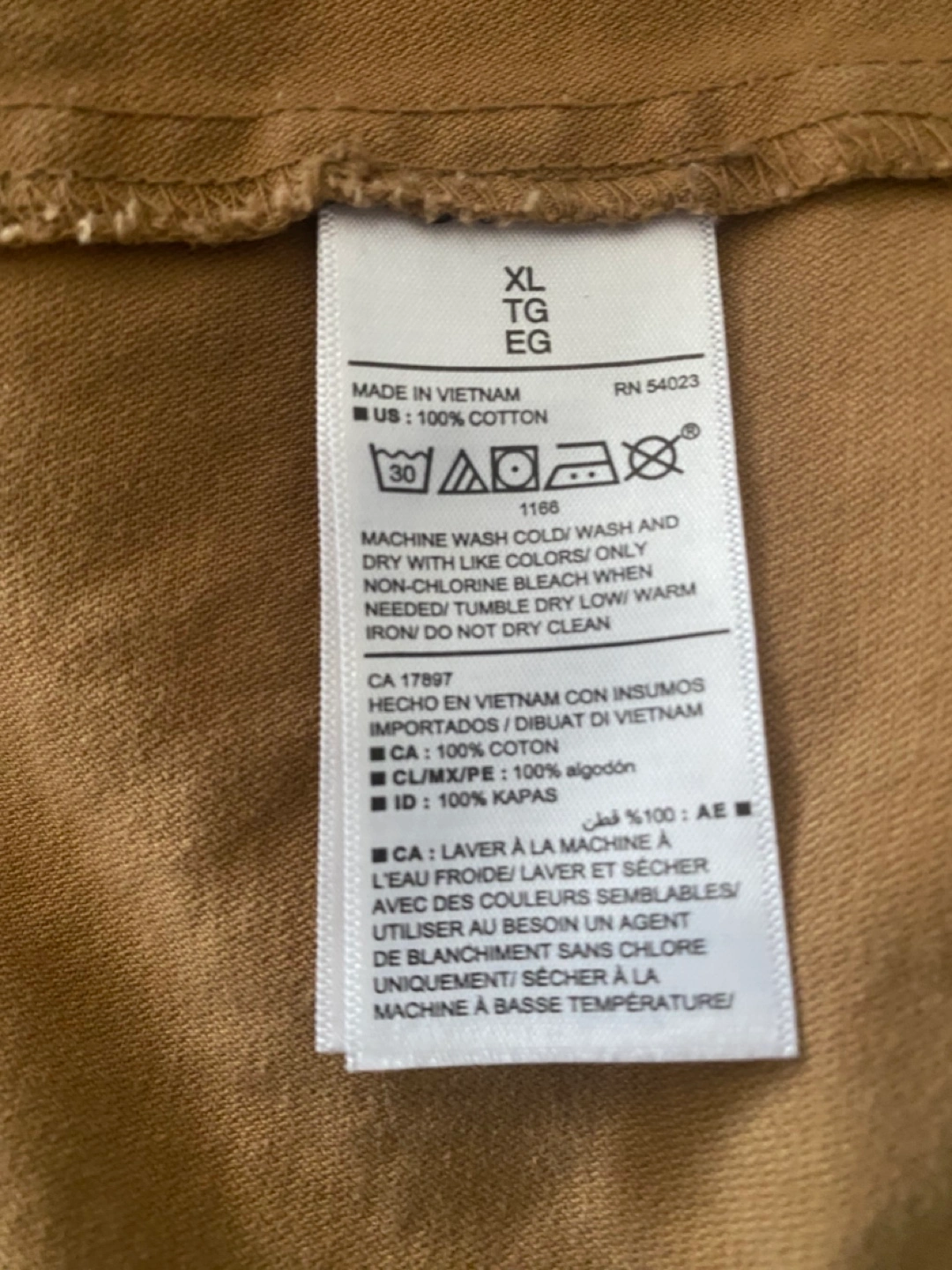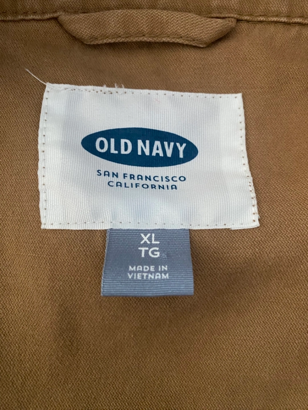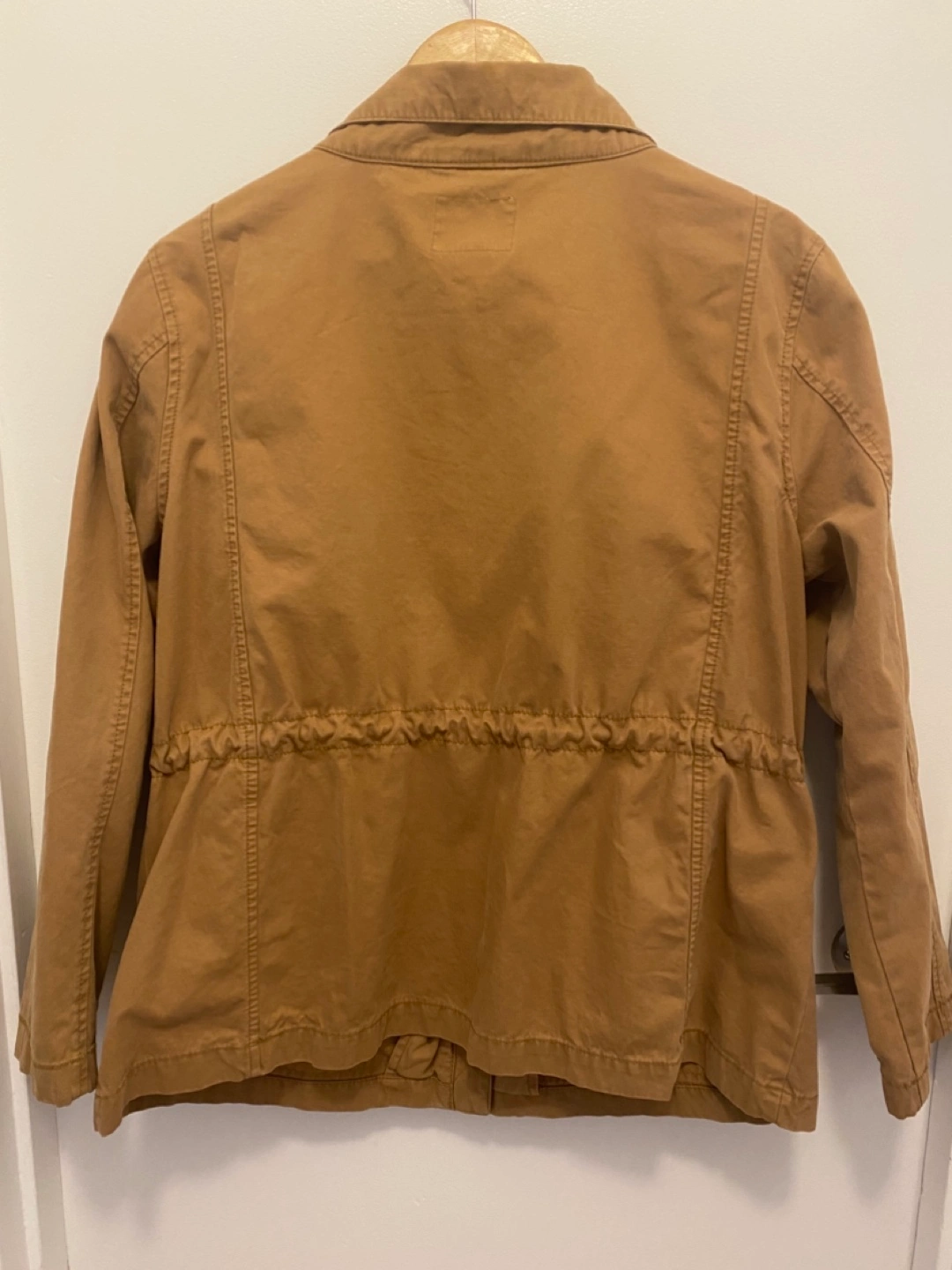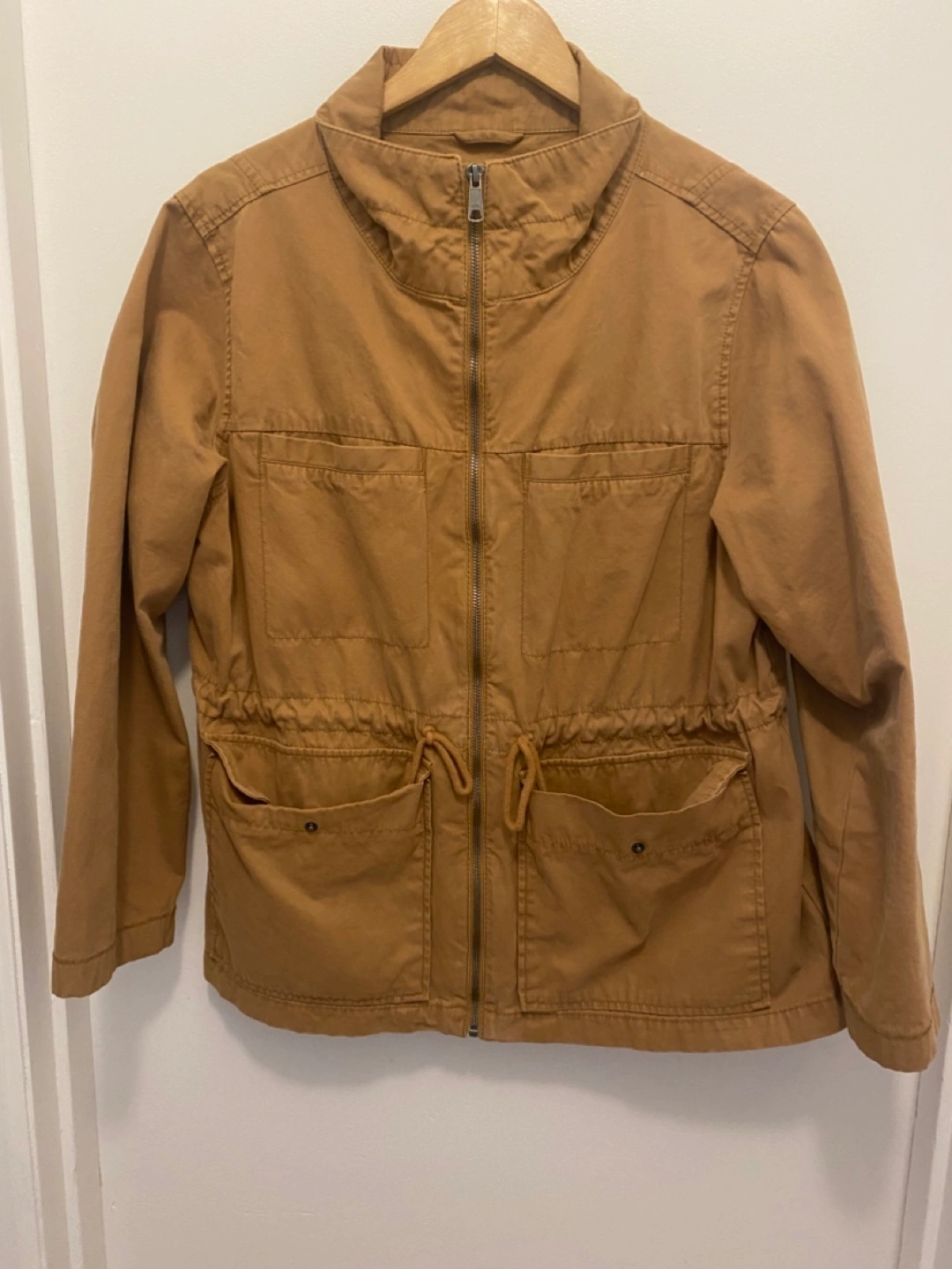 15Brown utility jacket. Long sleeves, zipper closure, drawstring waist. Multiple pockets. Size XL. 100% cotton. 28” long 23” long sleeves.