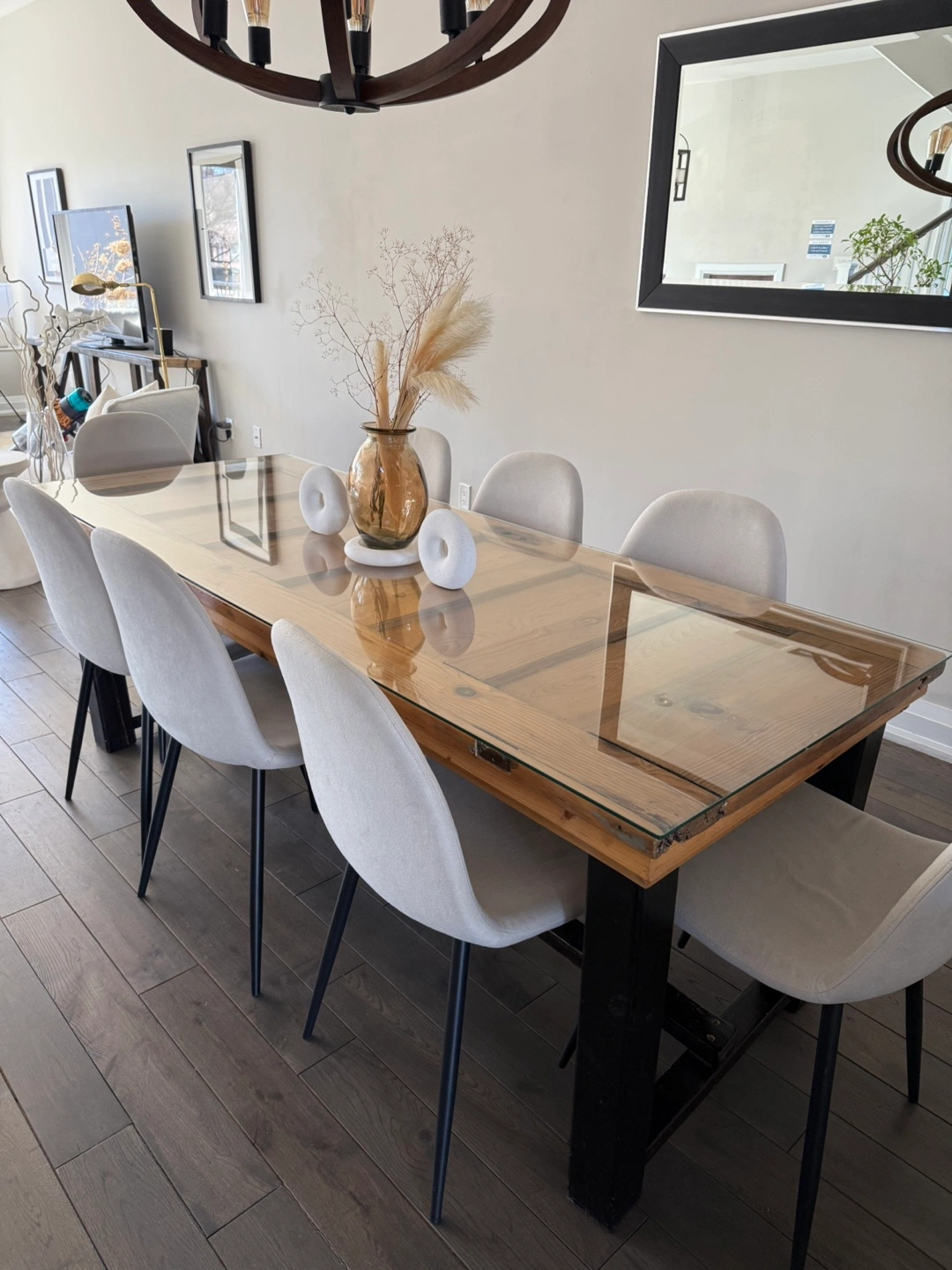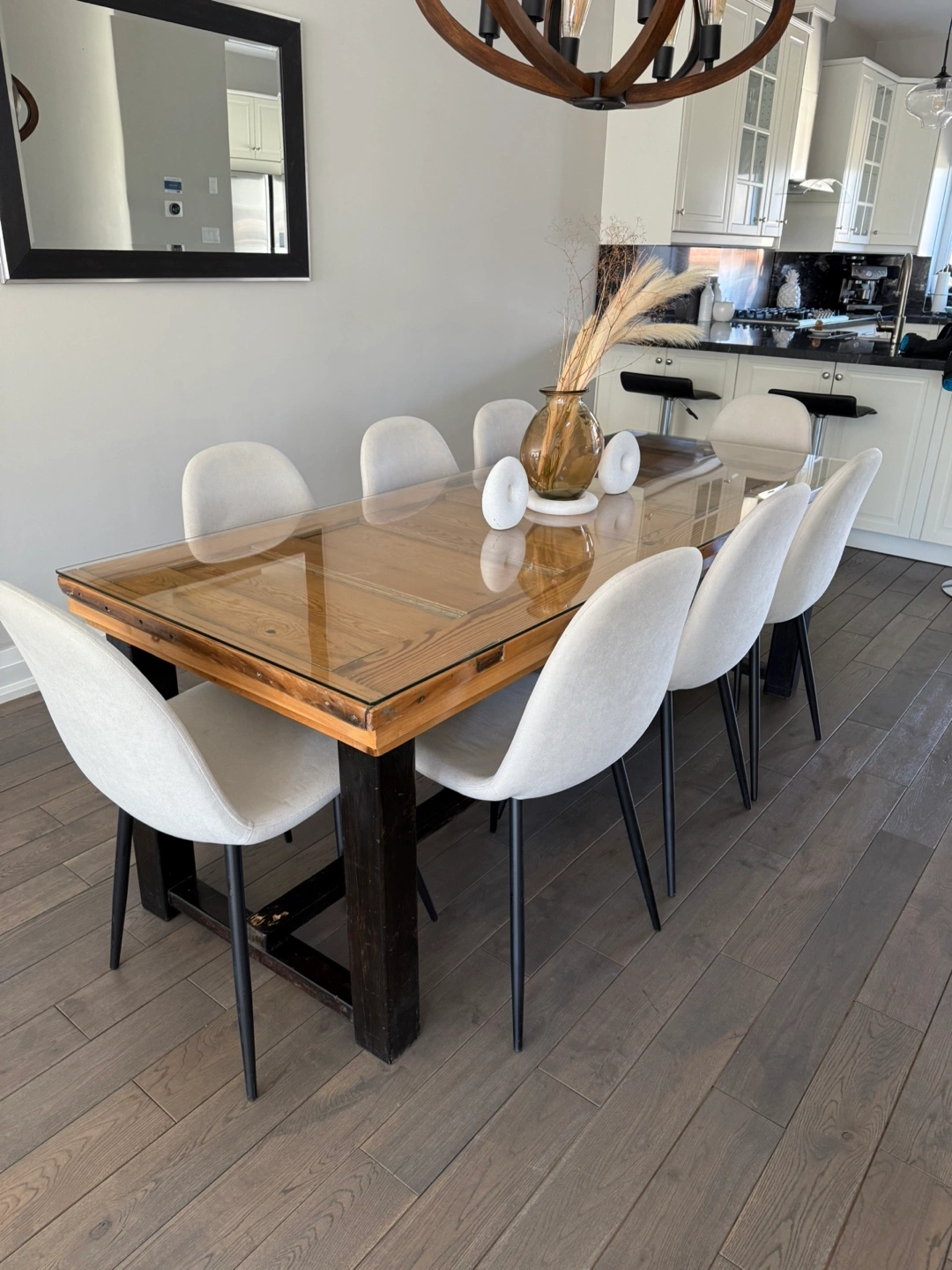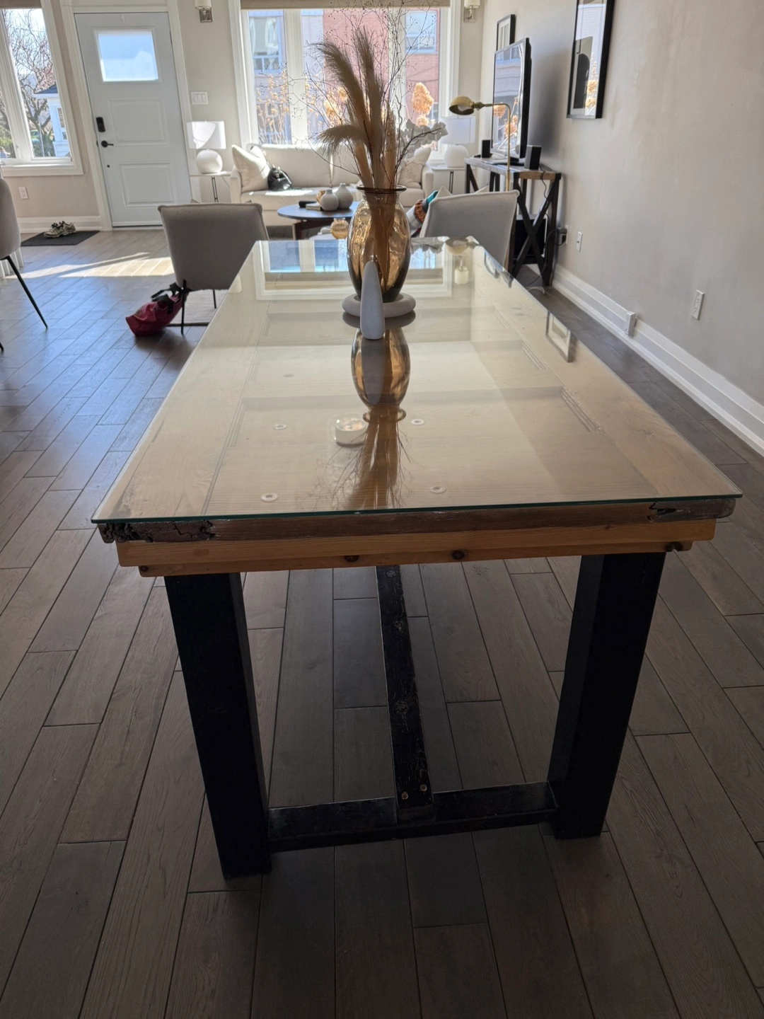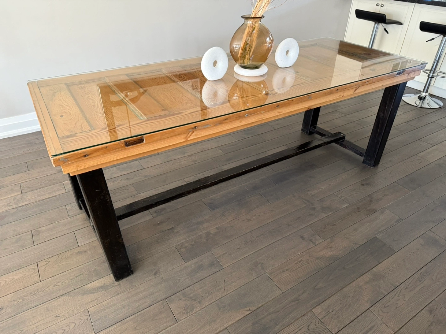 One of a kind, old, old cedar wood door dining table with custom made glass top. Length - 79 3/4 inches Width - 31 inches Height - 29 inches Pick up at Jane and Dundas street west (upper bloor west area). Note - for sale is only the dining table. Took a photo of the table with chairs to show it can accommodate 8 chairs.