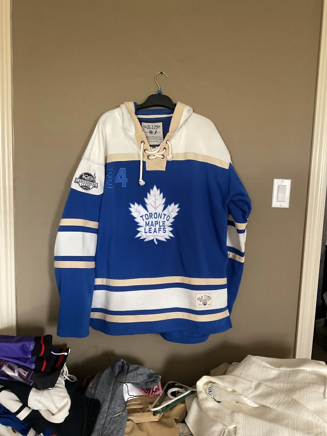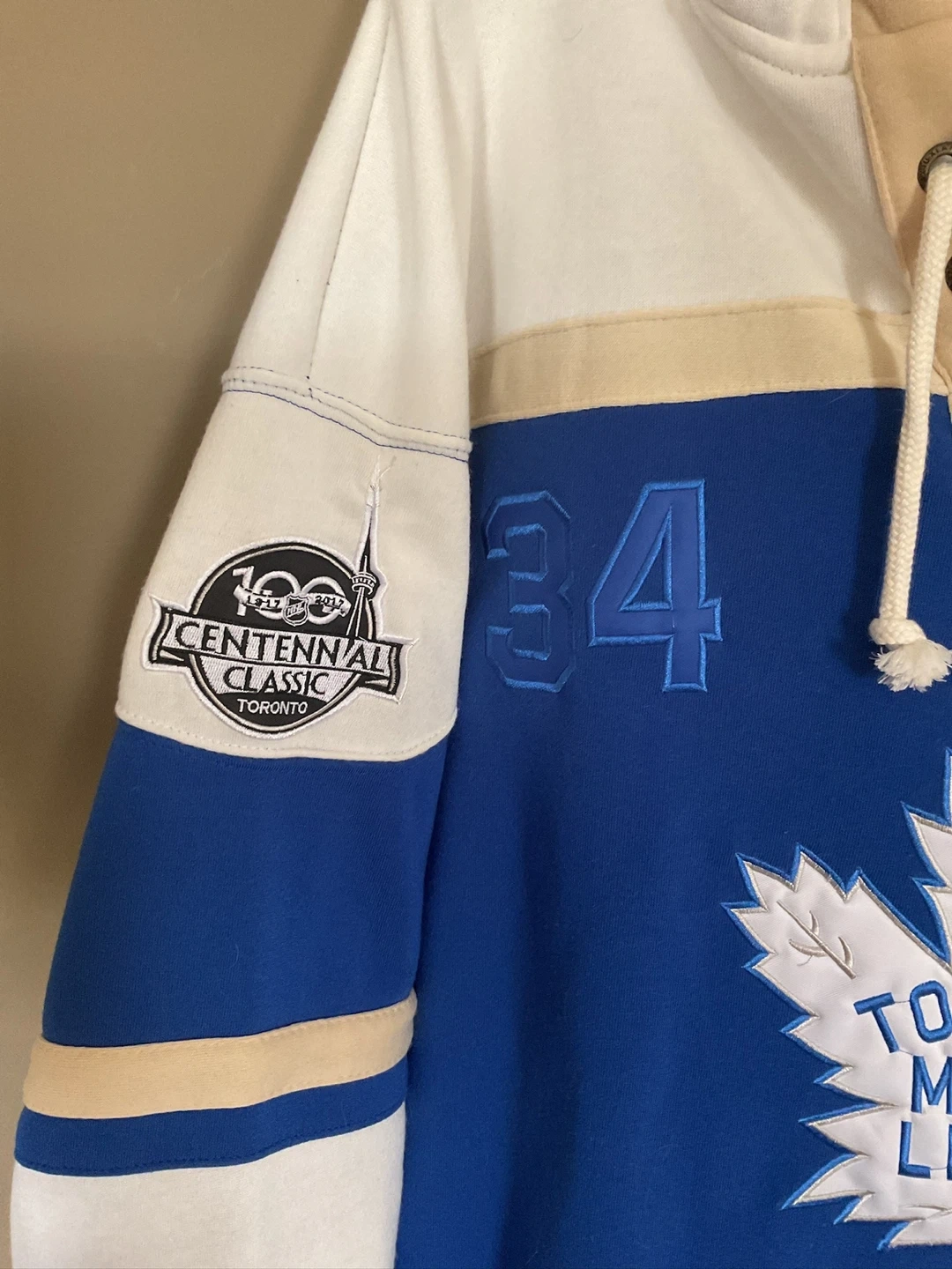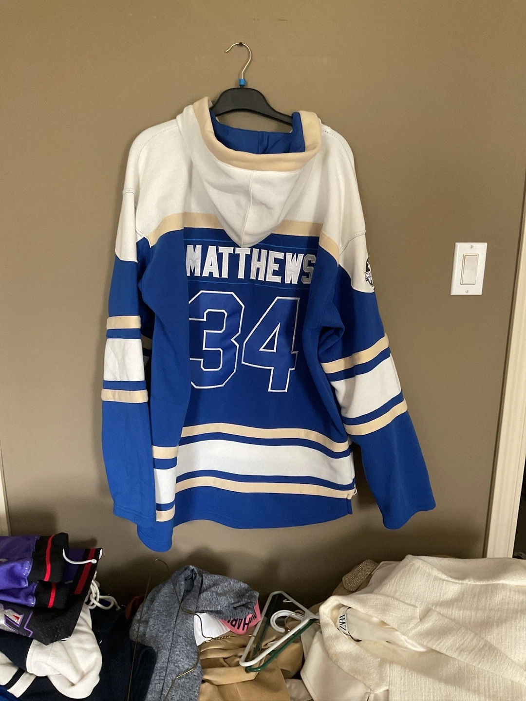Selling an Old Time Hockey hoodie featuring the Toronto Maple Leafs and Matthews' number 34. It's a size XXL and in great condition! The hoodie is blue, white, and beige with the Maple Leafs logo on the front and 'Matthews 34' on the back