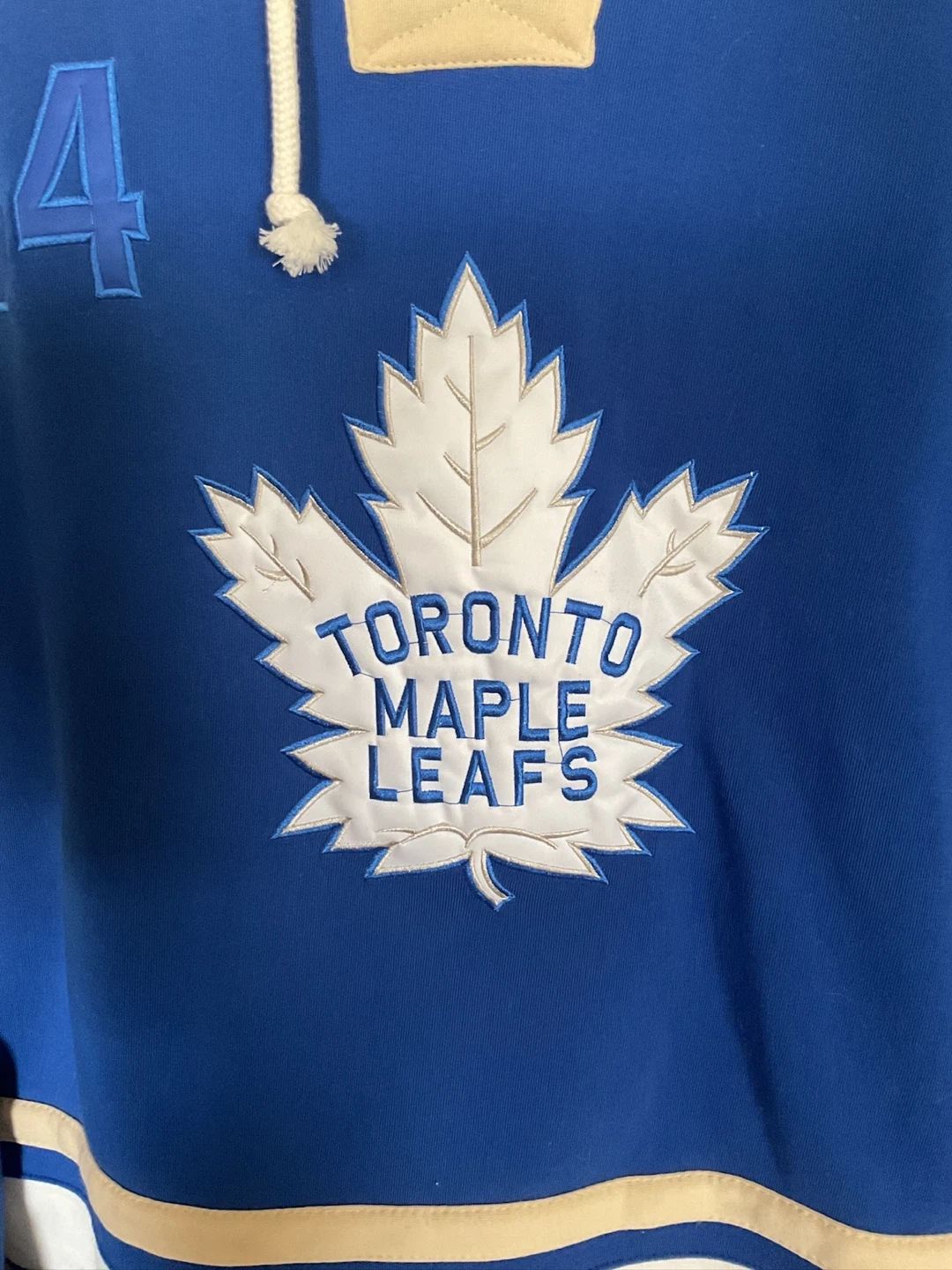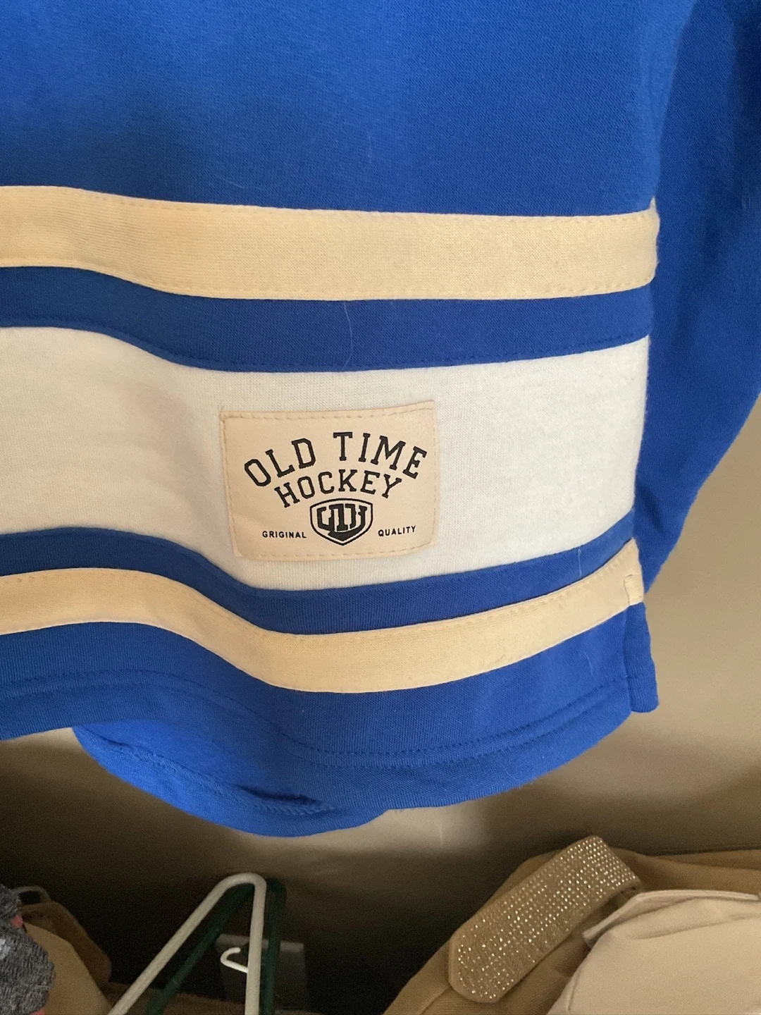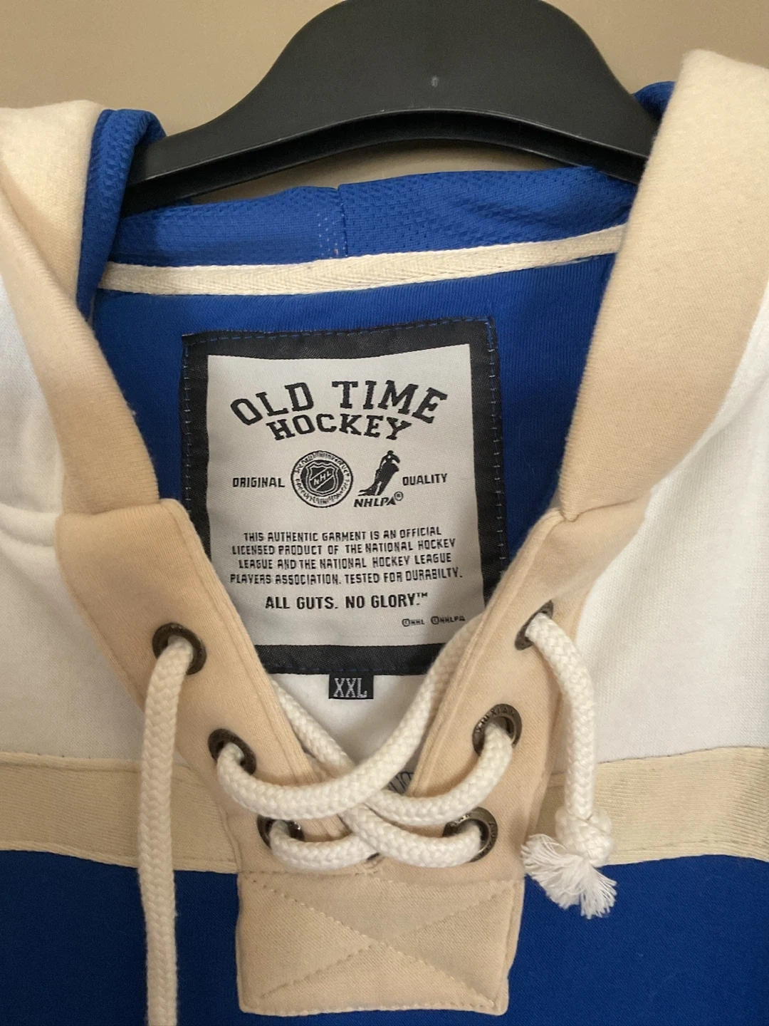 Selling an Old Time Hockey hoodie featuring the Toronto Maple Leafs and Matthews' number 34. It's a size XXL and in great condition! The hoodie is blue, white, and beige with the Maple Leafs logo on the front and 'Matthews 34' on the back