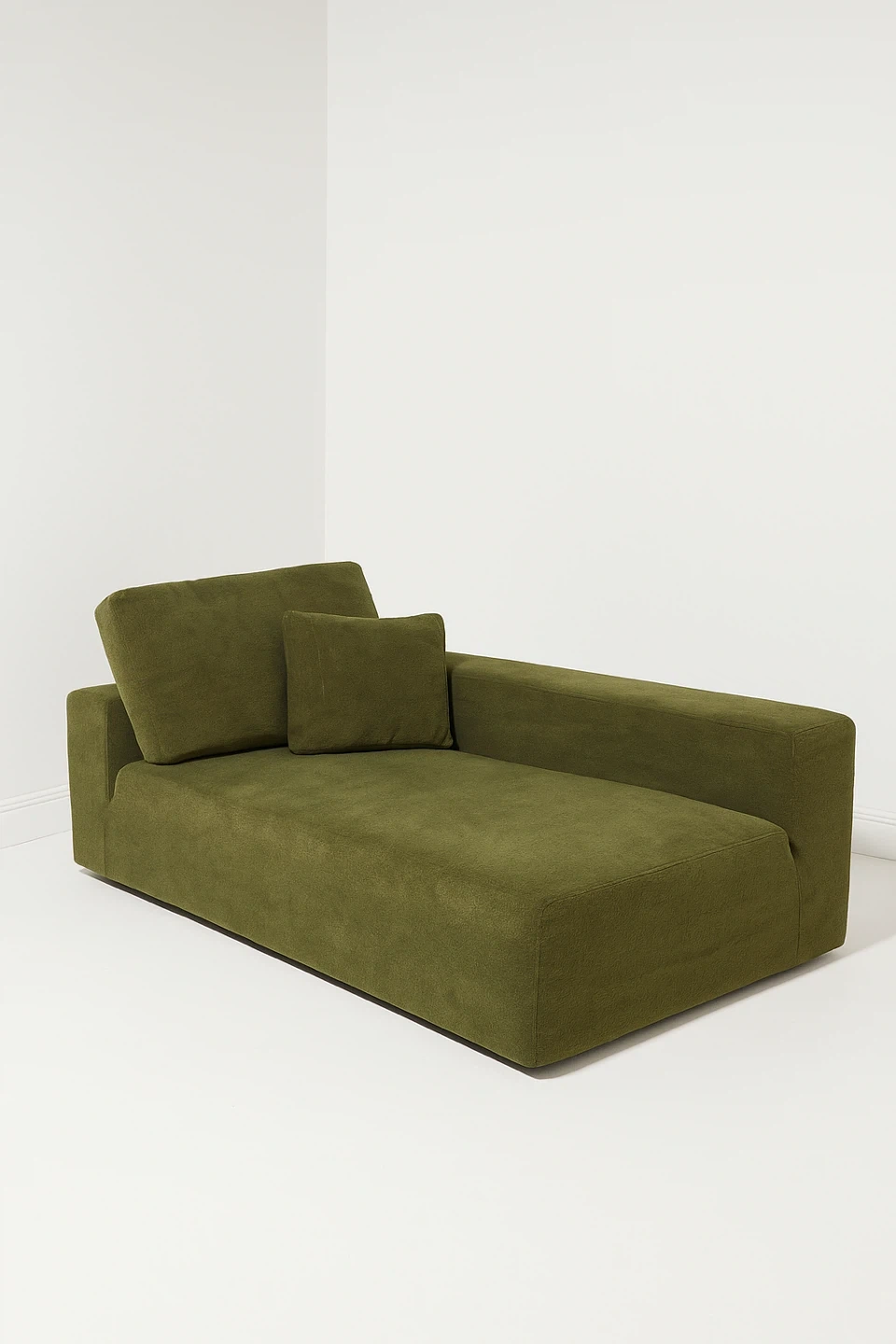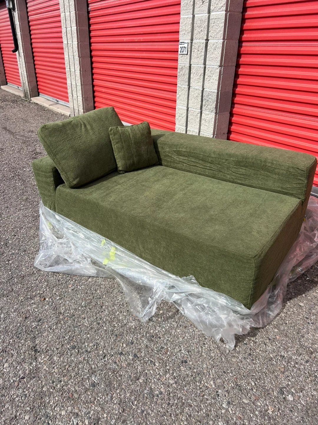 I'm selling a super comfy chaise lounge! It's in great condition and ready for a new home. It's a beautiful olive green color, perfect for adding a pop of color to your living space. It also comes with two matching pillows!