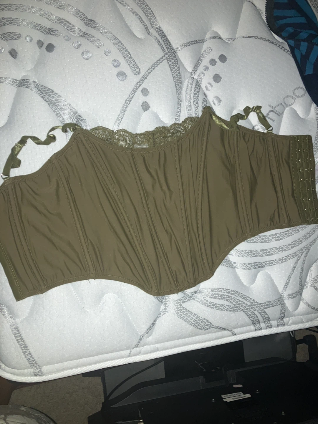 15Here's an olive green corset top! It has lace detailing along the top. Perfect for layering or wearing on its own