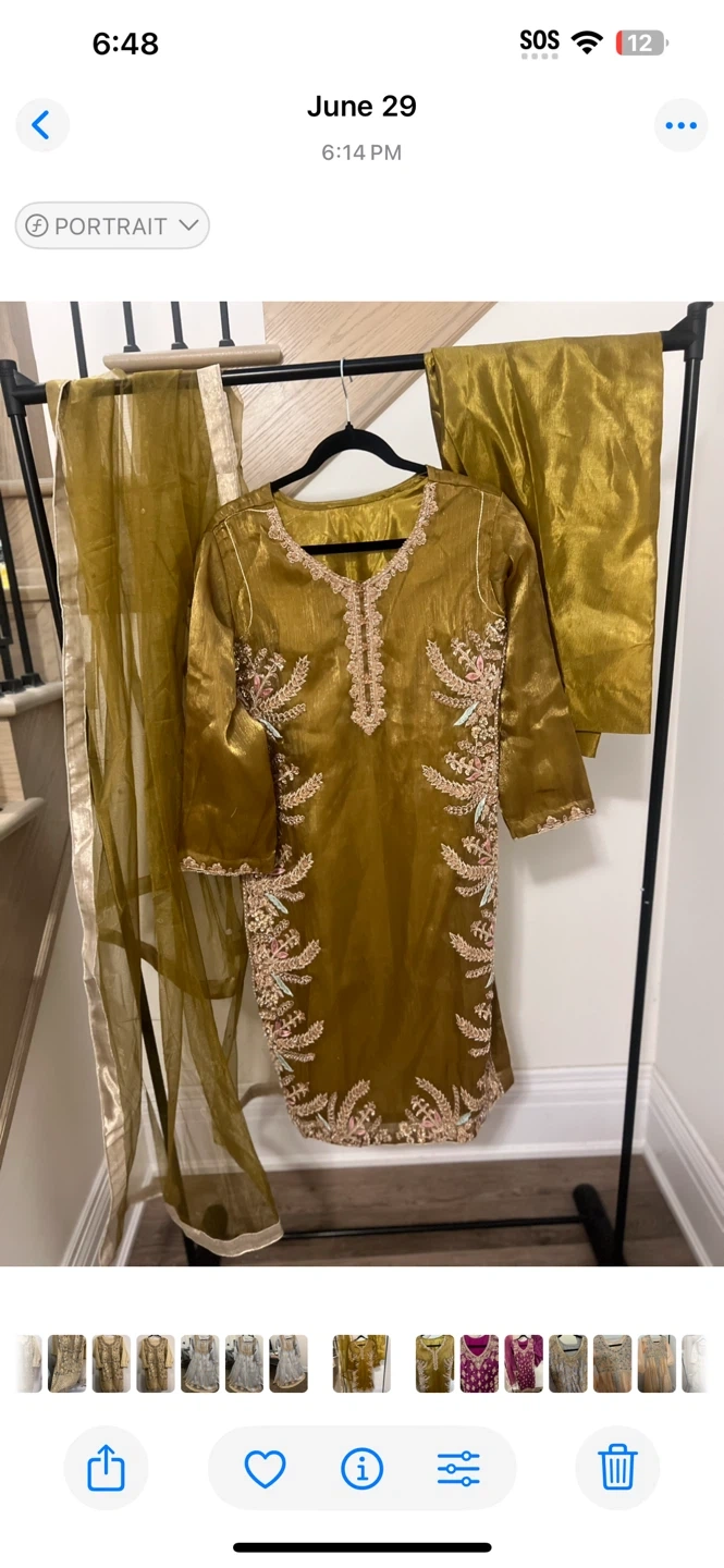 5Selling a beautiful olive green shalwar kameez with delicate embroidery. This set includes the kameez (top), shalwar (pants), and dupatta (scarf). It's in great condition and perfect for a special occasion!