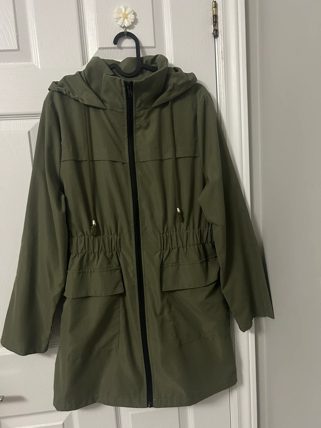 31A stylish olive green rain jacket with a hood! It's perfect for those unpredictable weather days. Features a zip-up front and handy pockets