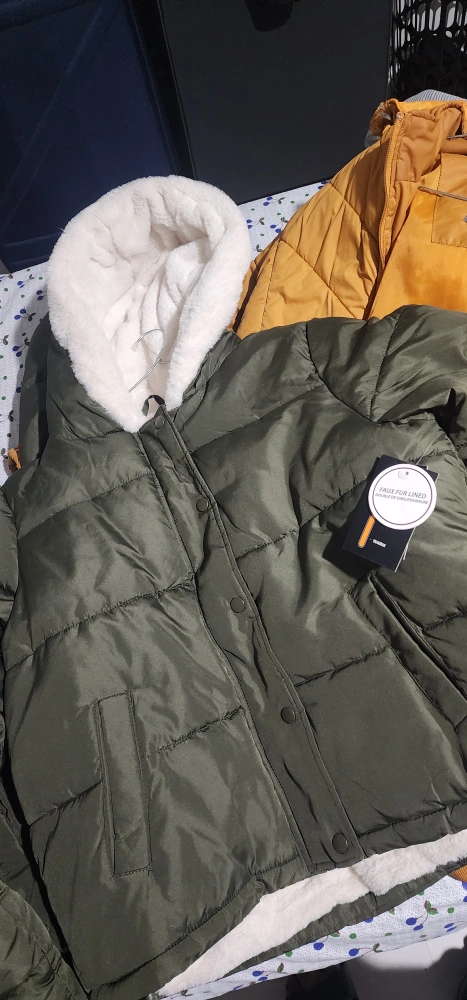 Warm olive green puffer jacket. Features a faux fur lined hood and snap button closure. Excellent for cold weather. new with tagsM and L size available