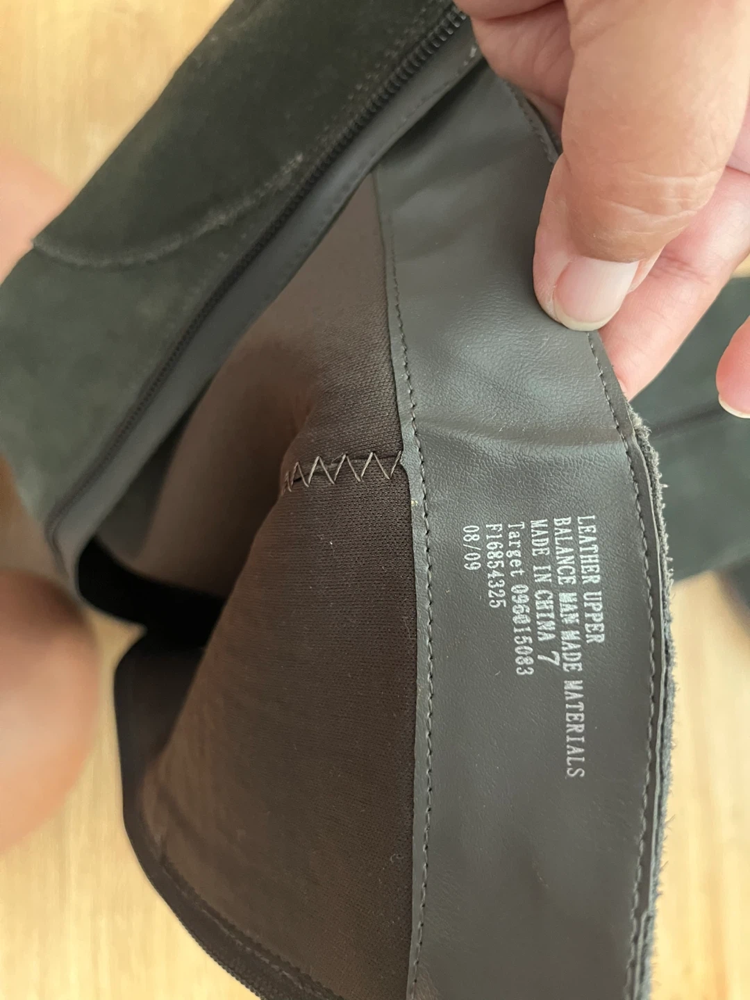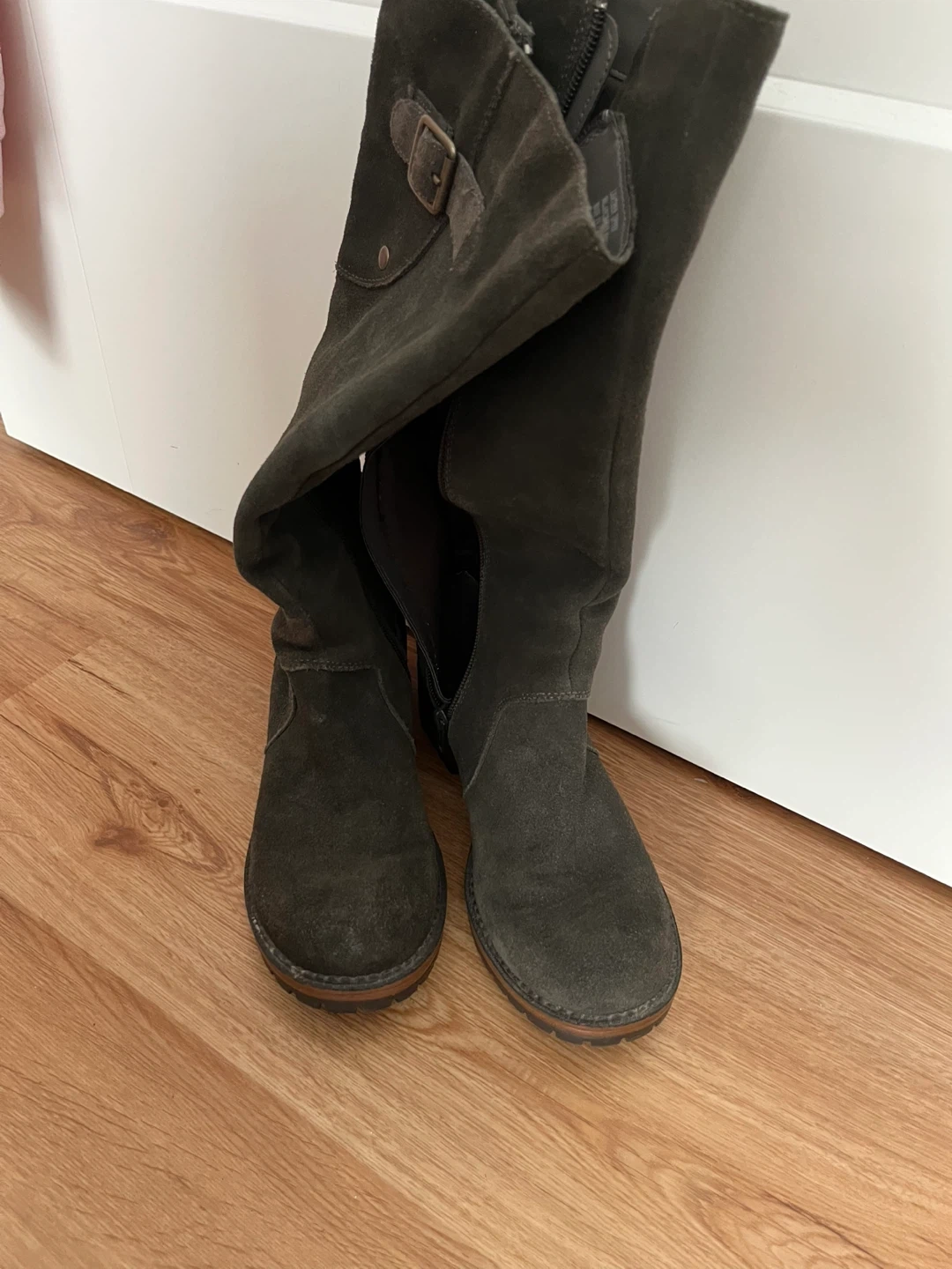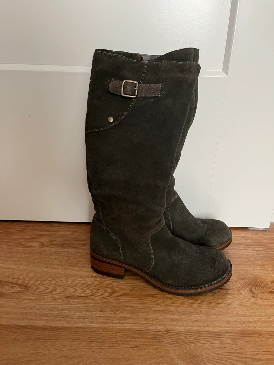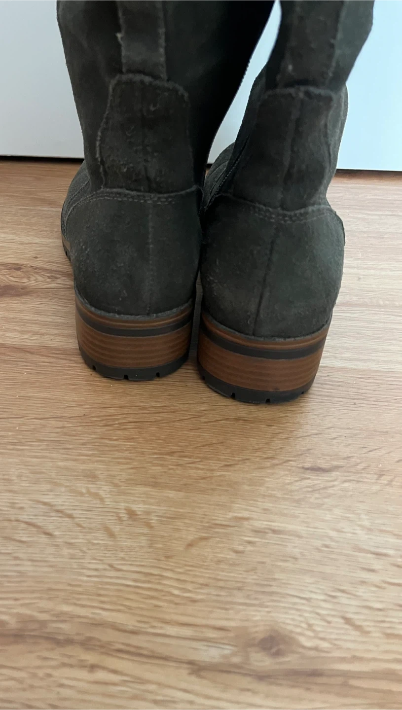 Selling a pair of olive green suede boots, size 7. They are in good condition and have a stylish buckle detail. Pick up in St Adolphe