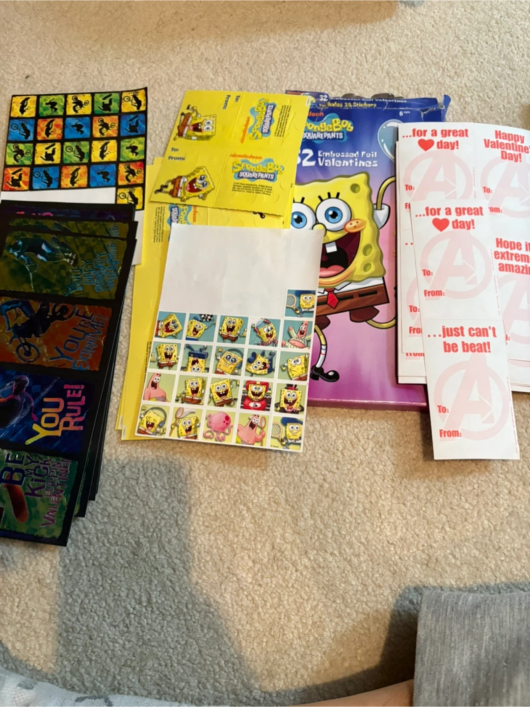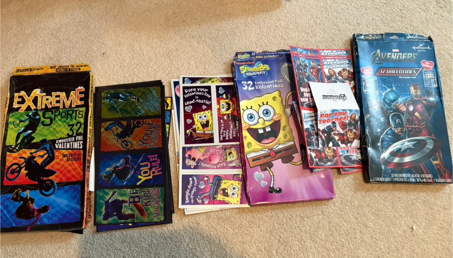 A collection of Valentine's Day cards for kids. Includes various themes such as Extreme Sports, Spongebob Squarepants, and Avengers Assemble. Each pack contains 32 valentines plus teacher cards