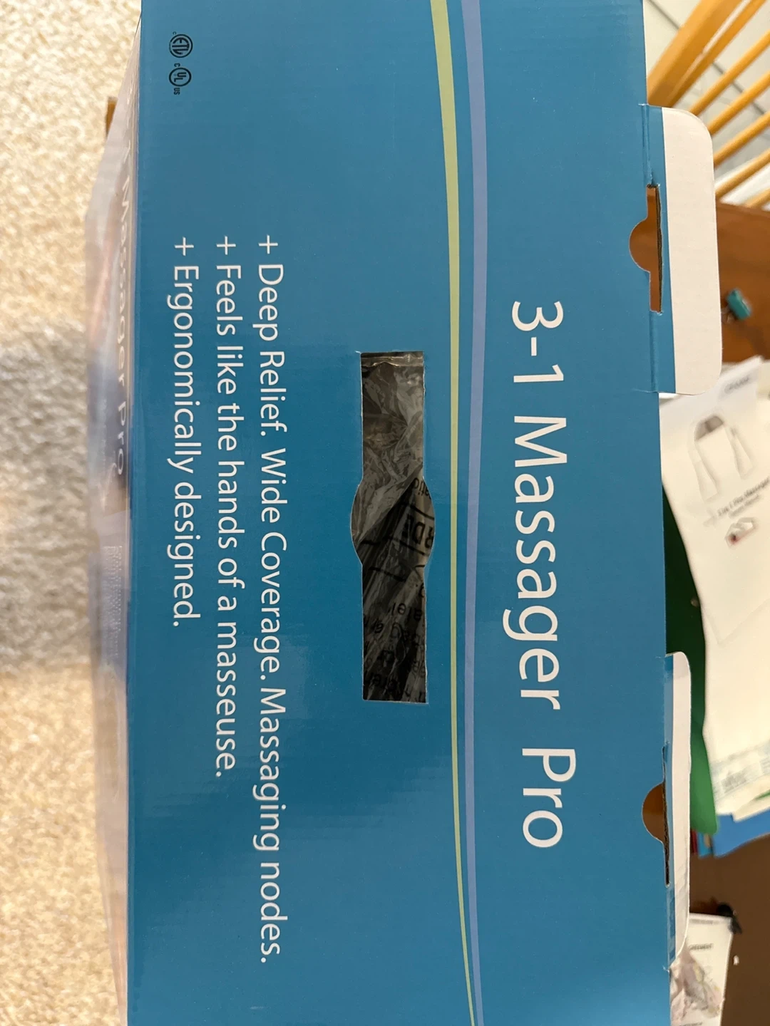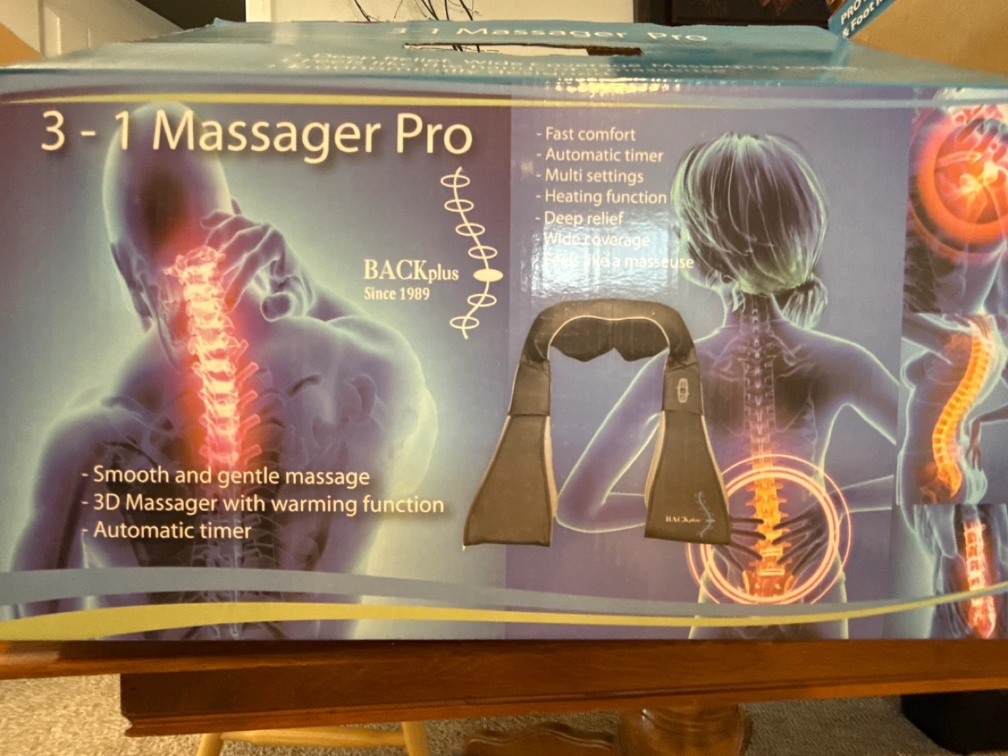 This 3-in-1 Massager Pro offers deep relief with wide coverage and massaging nodes. It's ergonomically designed and feels like hands of a masseuse. This massager includes fast comfort, an automatic timer, and multiple settings with a heating function. It's useful for targeting sore muscles and for a relaxing massage experience.