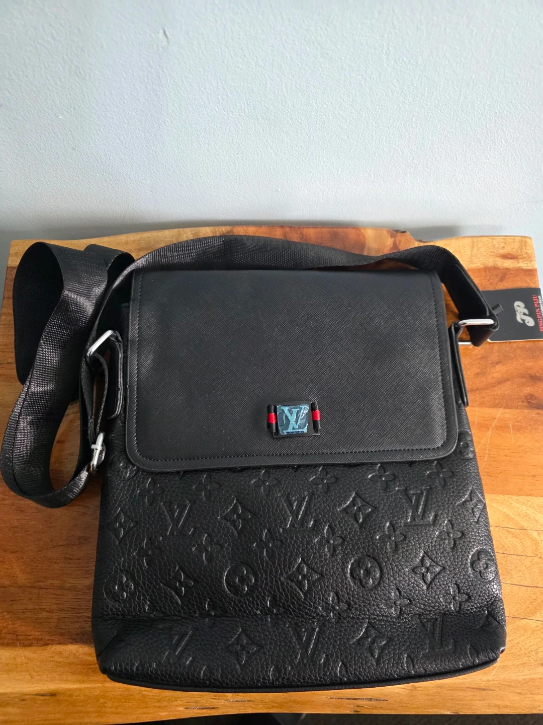 This is a black Louis Vuitton messenger bag. It's made of leather with the signature LV monogram pattern. The strap is adjustable for comfort.