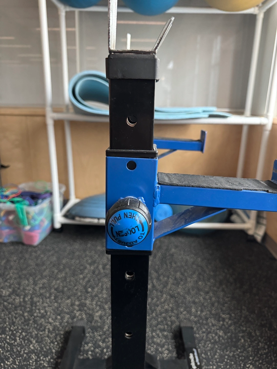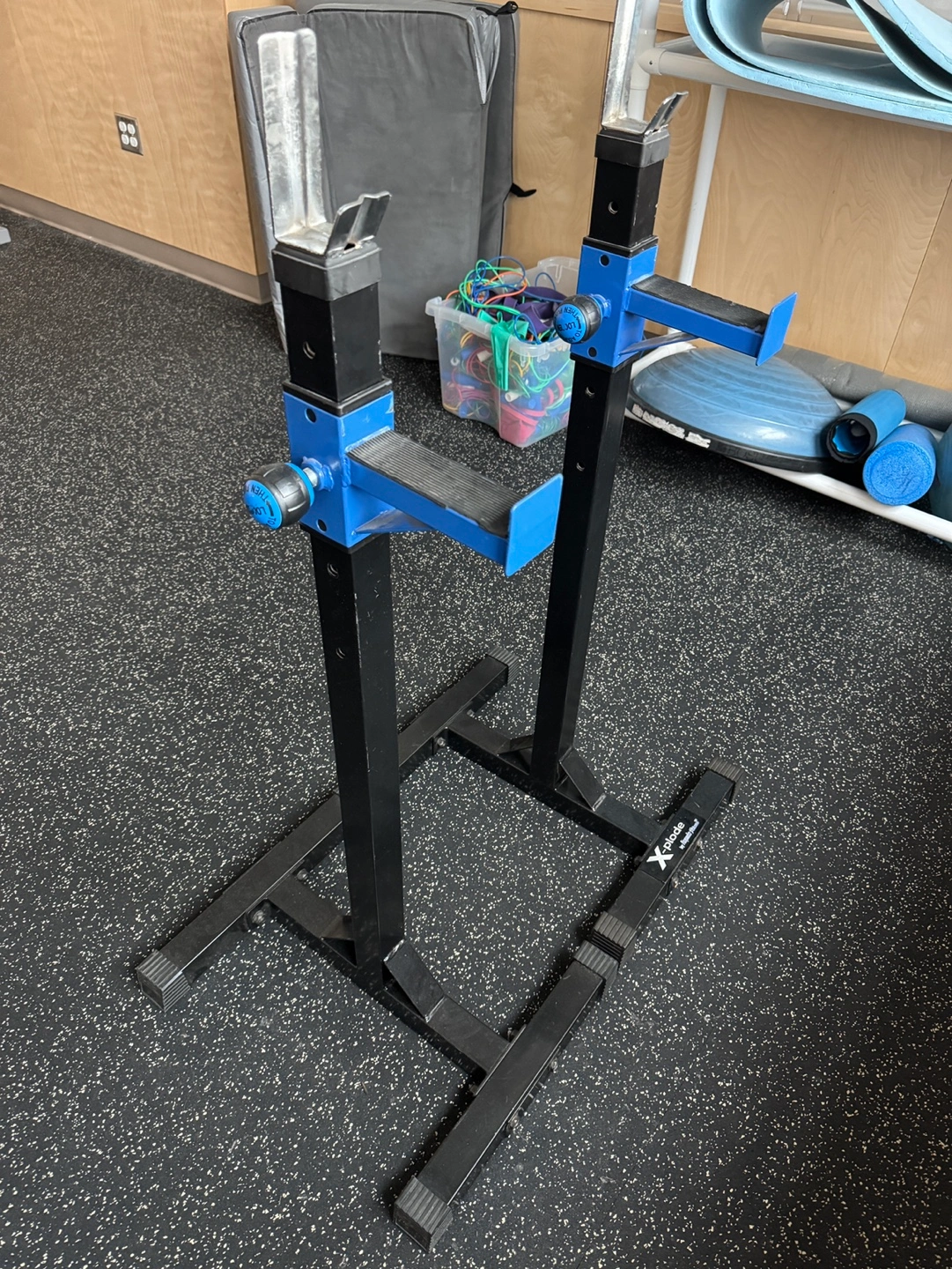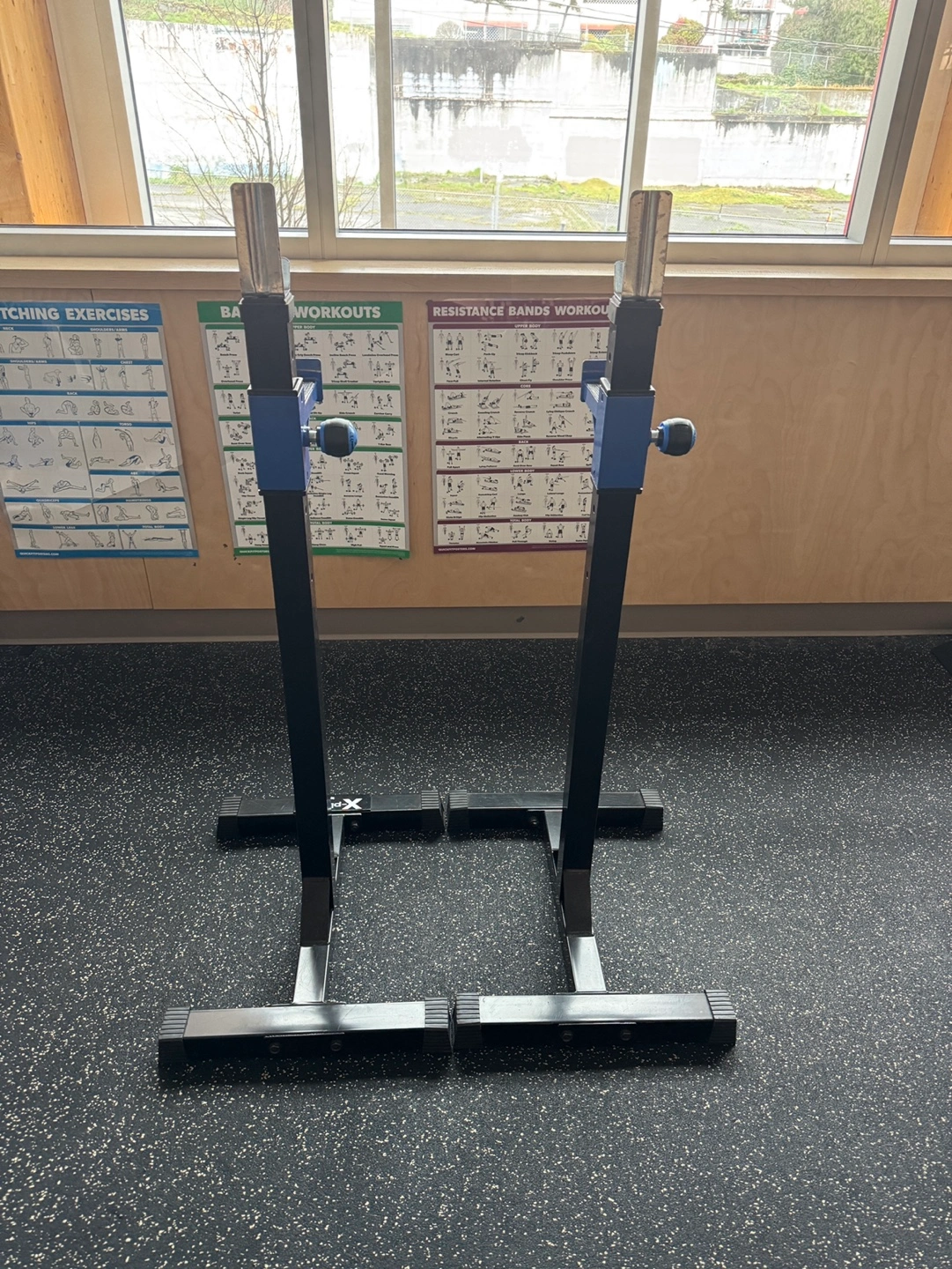 Used pair of XMark squat stands. Black metal frame with blue accents. Adjustable height. Good for home gym.