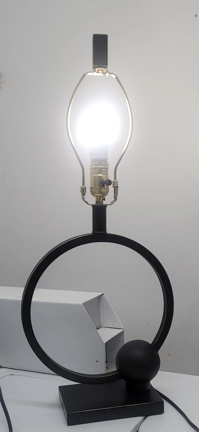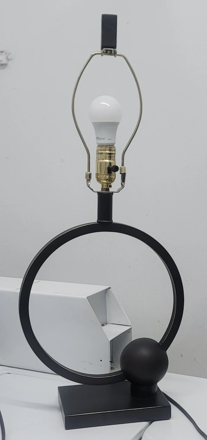 Black metal table lamp with a modern design. Features a circular accent with a sphere detail. Includes an LED light bulb. Great for adding a stylish touch to any room!