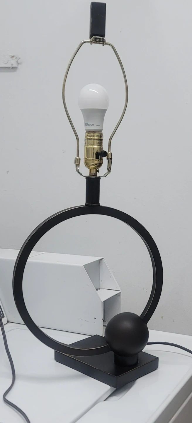 Black metal table lamp with a modern design. Features a circular accent with a sphere detail. Includes an LED light bulb. Great for adding a stylish touch to any room!