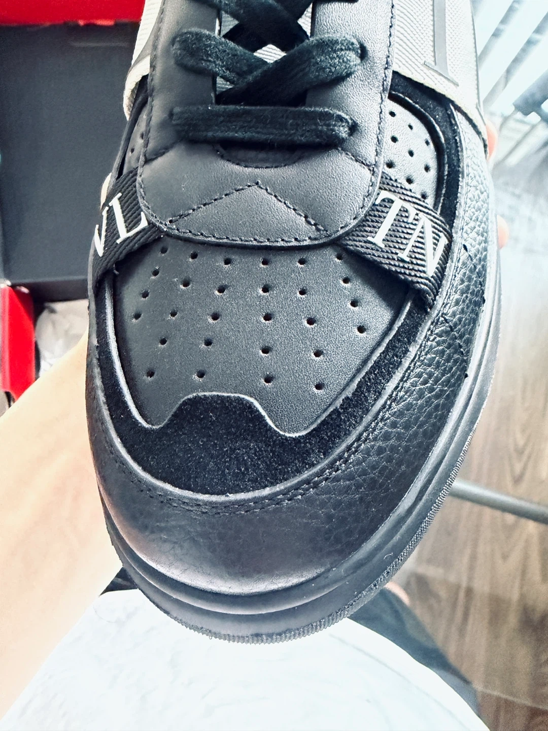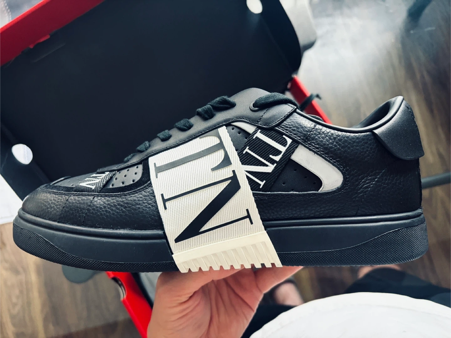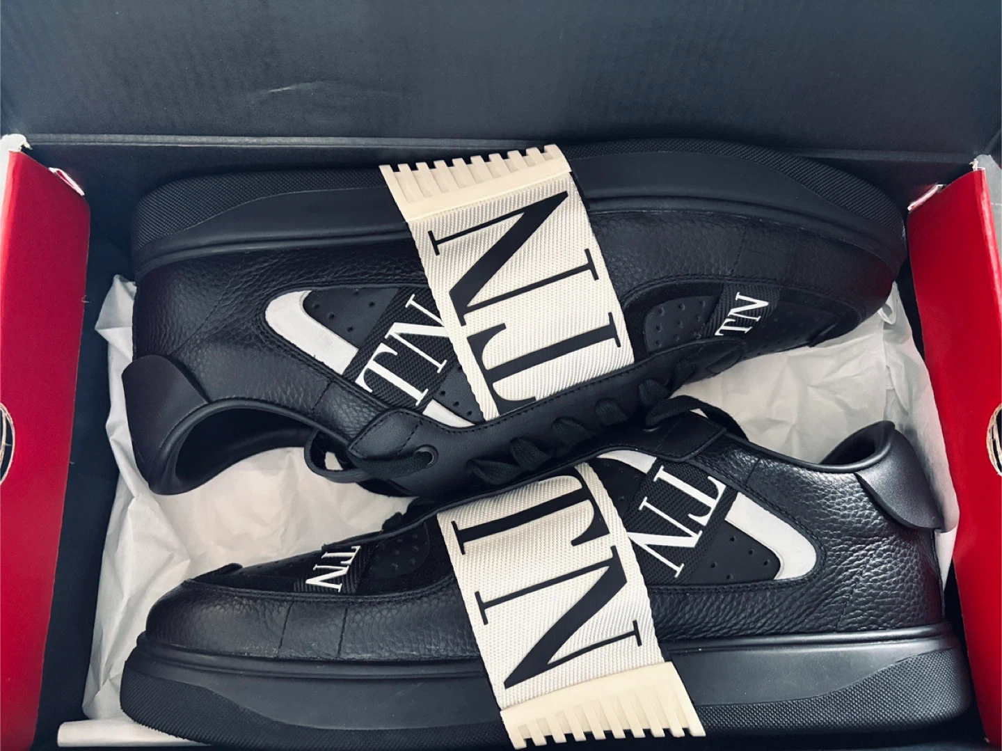 Valentino Garavani black leather sneakers with white strap detail. Made in Italy. Selling my dad’s shoes that never been worn. US M 11-11.5