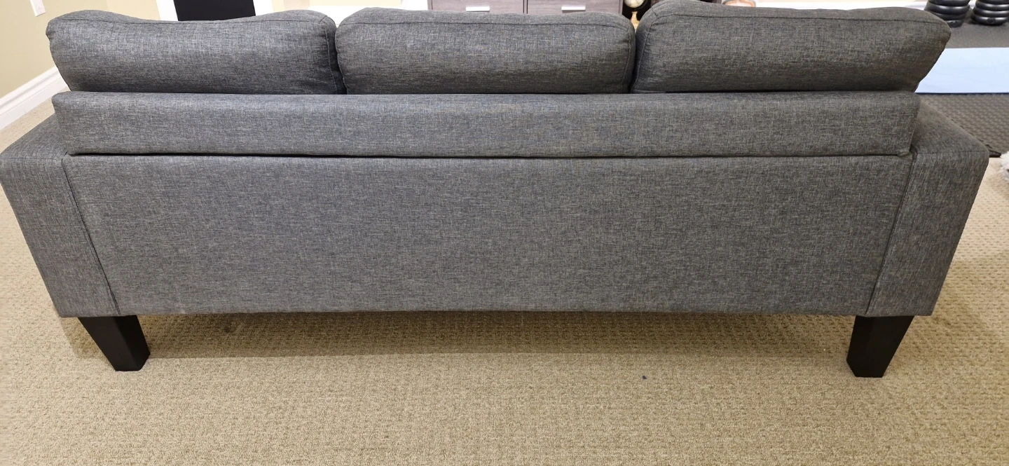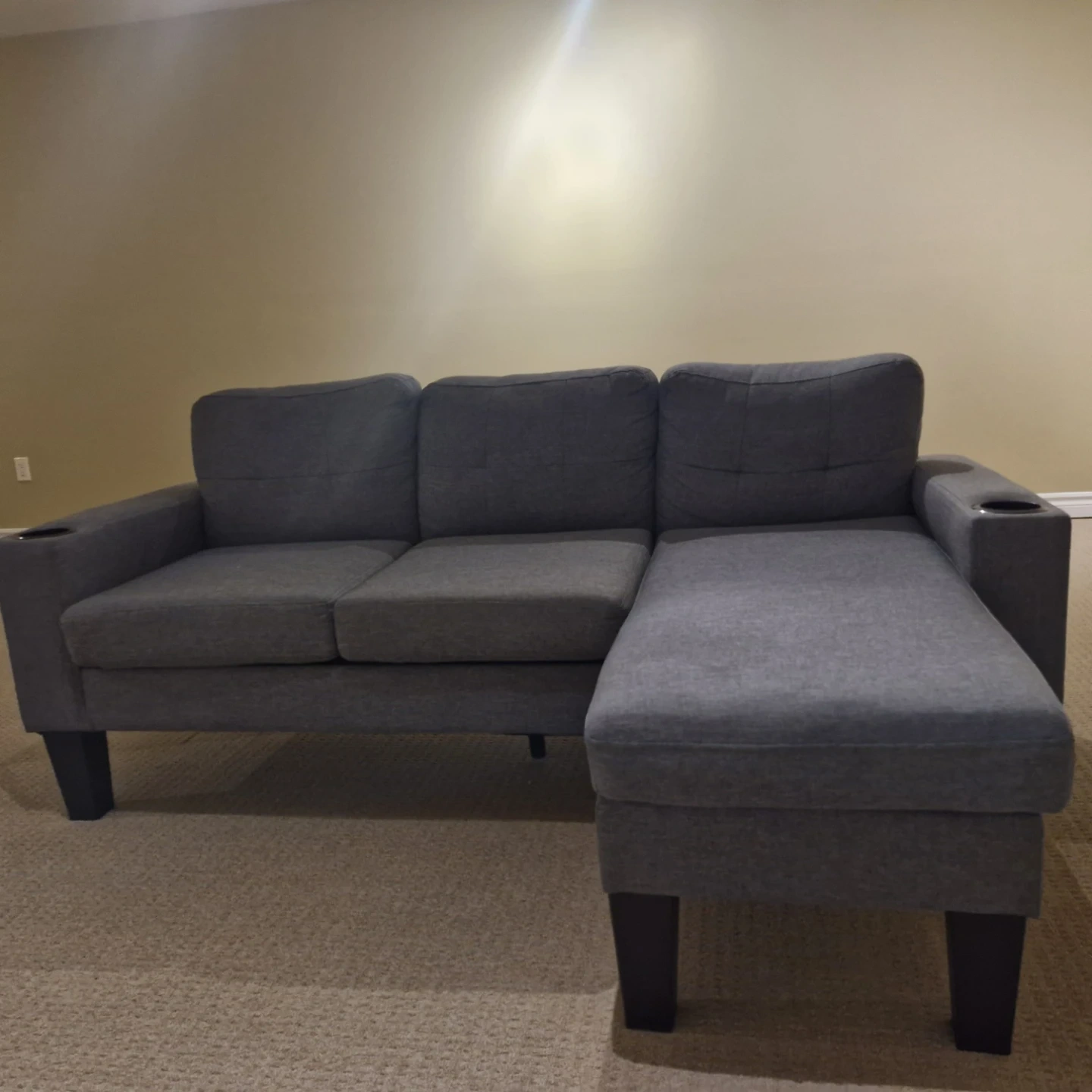 Grey fabric 3-seater sectional sofa with a chaise lounge. It has built-in cup holders on both armrests. This couch provides comfy seating for your living space