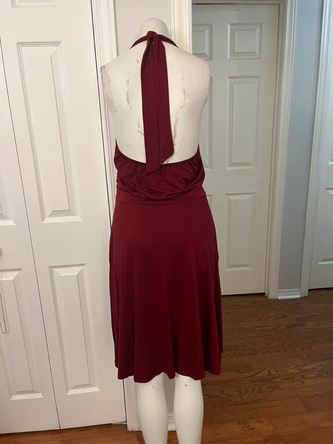 A maroon halter neck dress with a deep V-neck and ruched detailing at the waist. The fabric is a soft, stretchy material. It's a knee-length style with a flattering fit, and 2 pockets