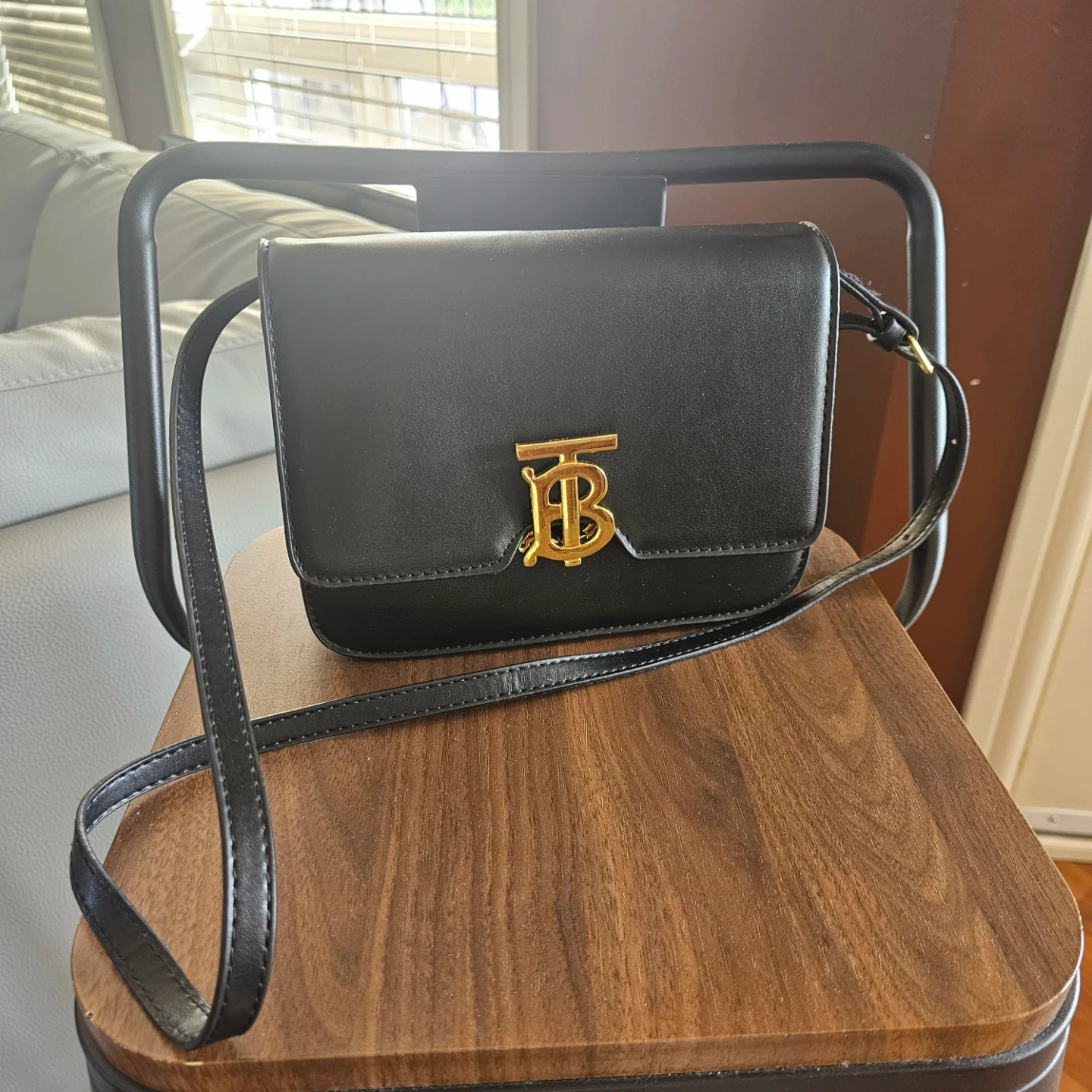 Black leather shoulder bag by Burberry. It features a gold-tone TB monogram clasp closure. Includes adjustable shoulder strap. This bag's construction is sleek and versatile. Real leather