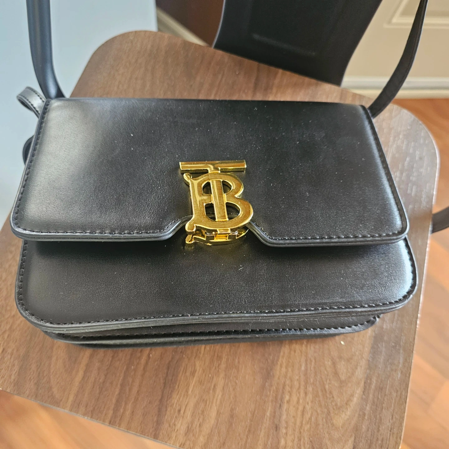 Black leather shoulder bag by Burberry. It features a gold-tone TB monogram clasp closure. Includes adjustable shoulder strap. This bag's construction is sleek and versatile. Real leather