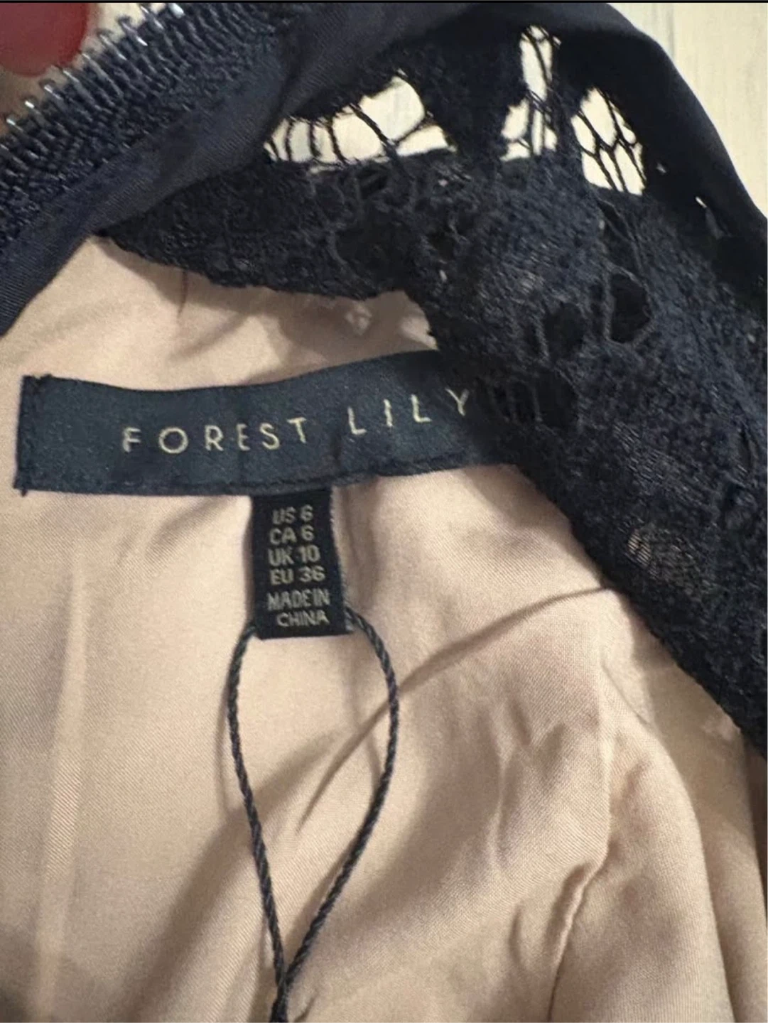 This is a beautiful Forest Lily dress, brand new with tags! It features a lovely black lace overlay and is a size 6.
