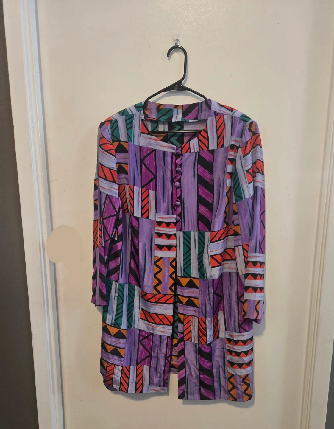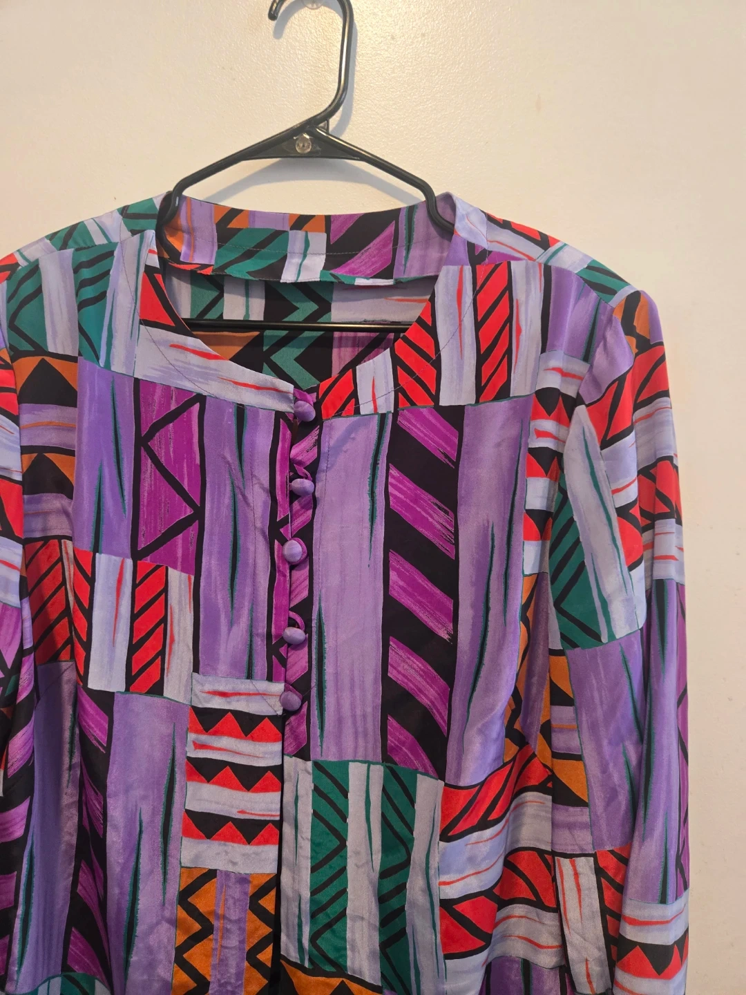 Geometric print in shades of purple, orange, red, and green. It's a button-up style with a V-neckline and long sleeves. Fits Medium and Small.
