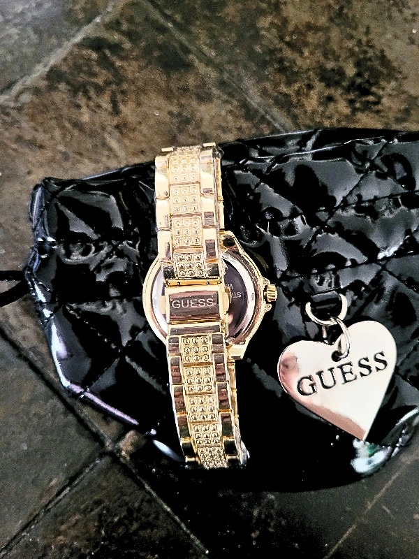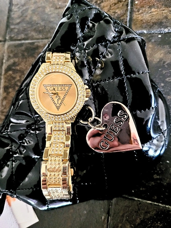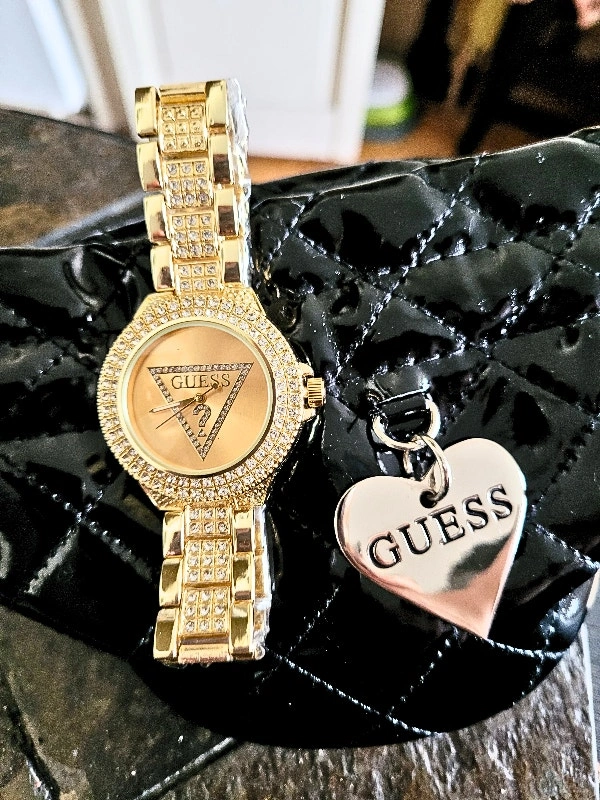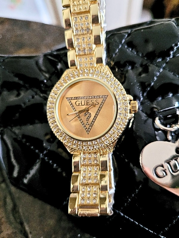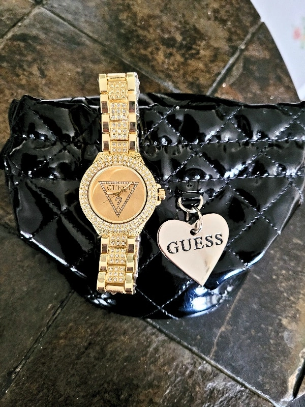 Brand new Guess watch with Swarovski crystals, comes with a black pouch. Dial diameter: 37mm. Band length: 20cm. Case thickness: 1.1mm. Style: Luxury, Dress, Fashion. Band material: Stainless Steel. Case material: Stainless Steel. Pick up near Sheppard & Don Mills. Cash and cashless payments accepted.