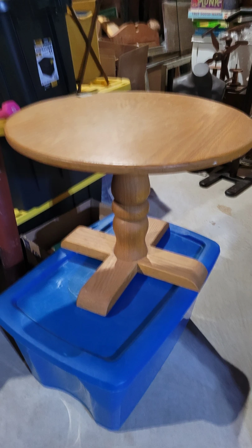 This is a round wooden pedestal table. It's a nice accent piece for any room. The base is constructed with a sturdy cross design. It's perfect for holding a plant or a decorative item!