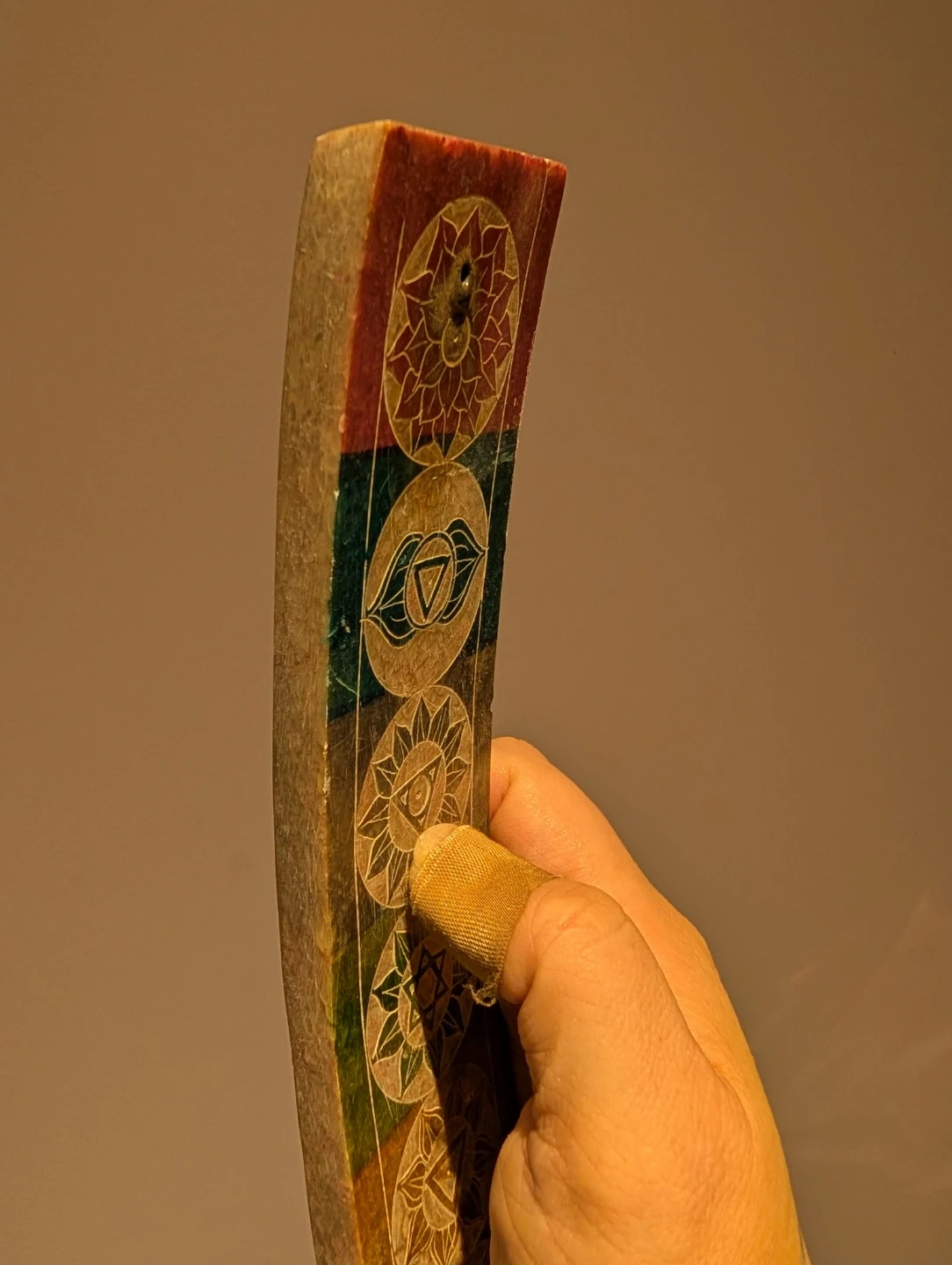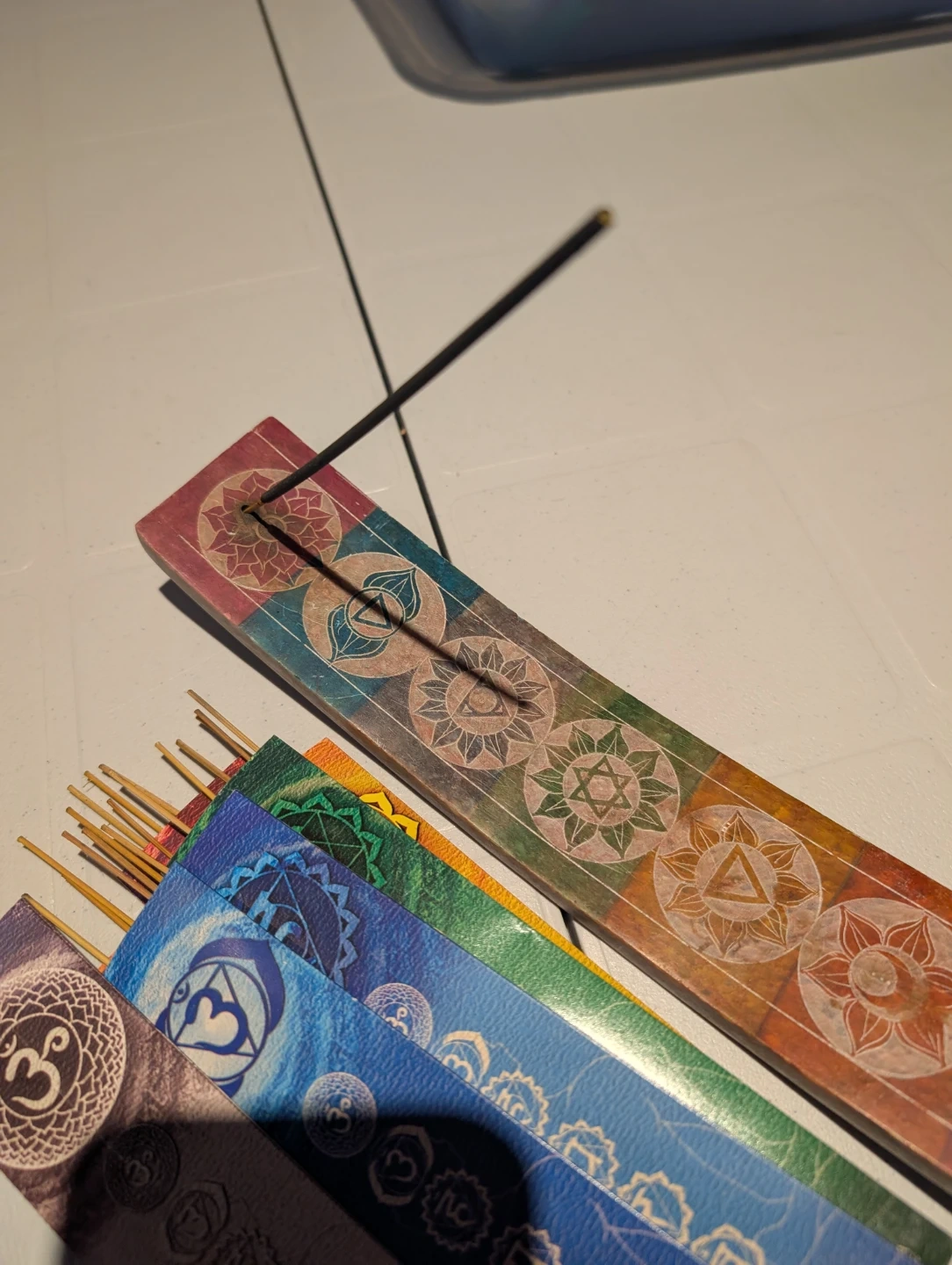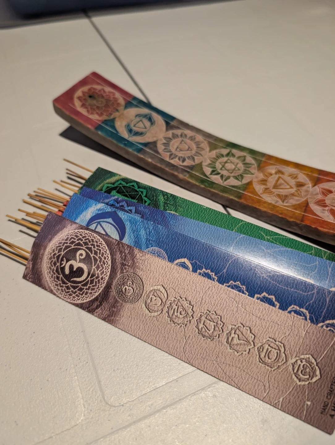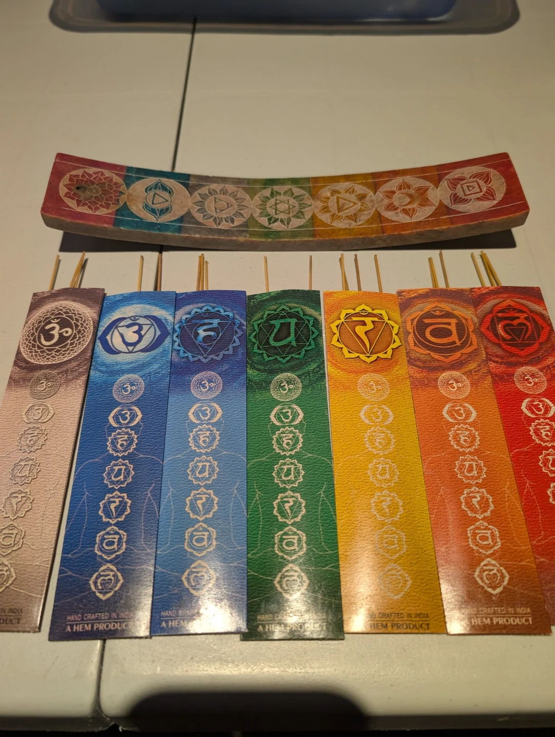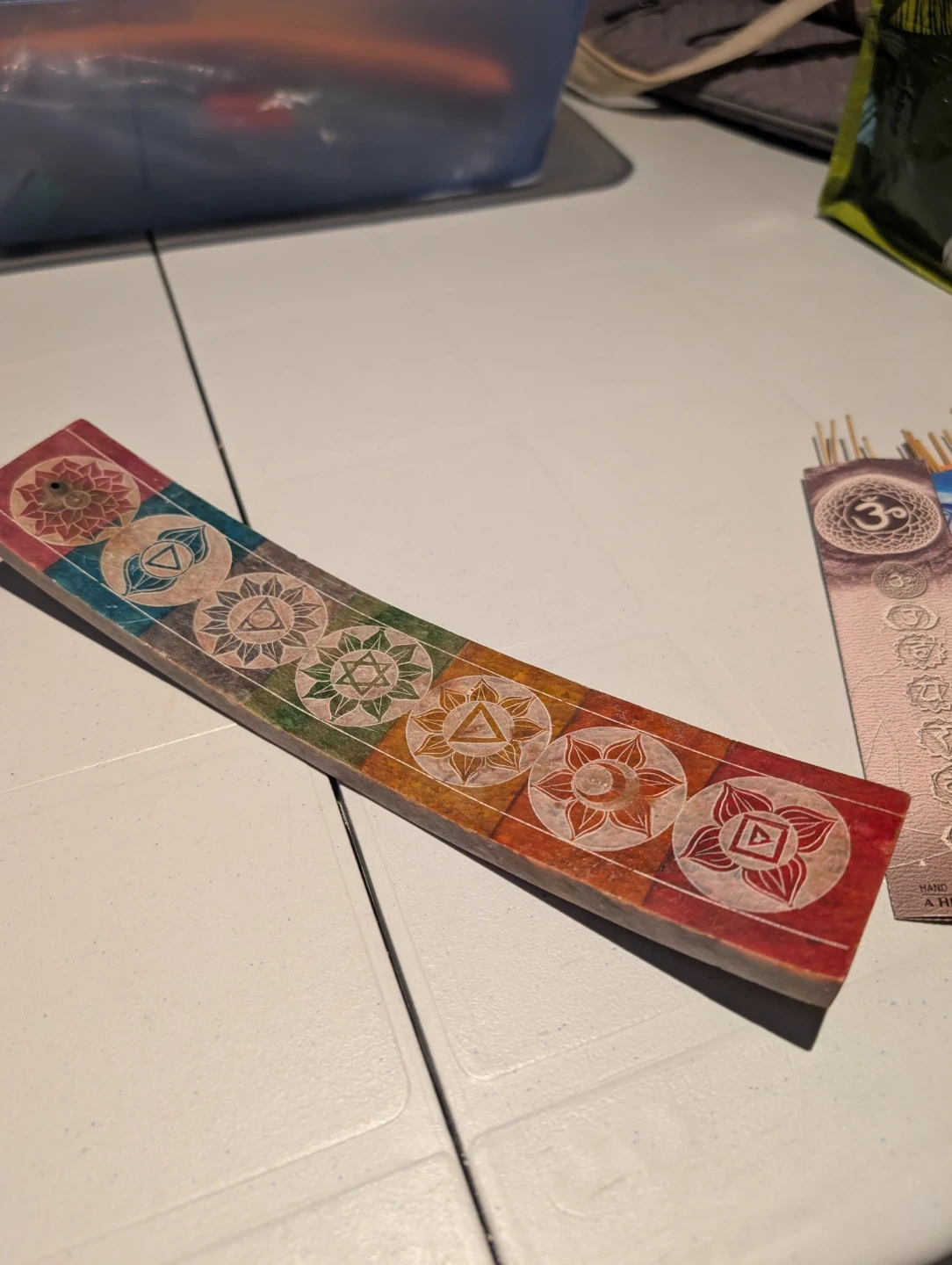 This is a wooden incense burner featuring a rainbow chakra design. It comes with a pack of incense sticks. Hand crafted in India.