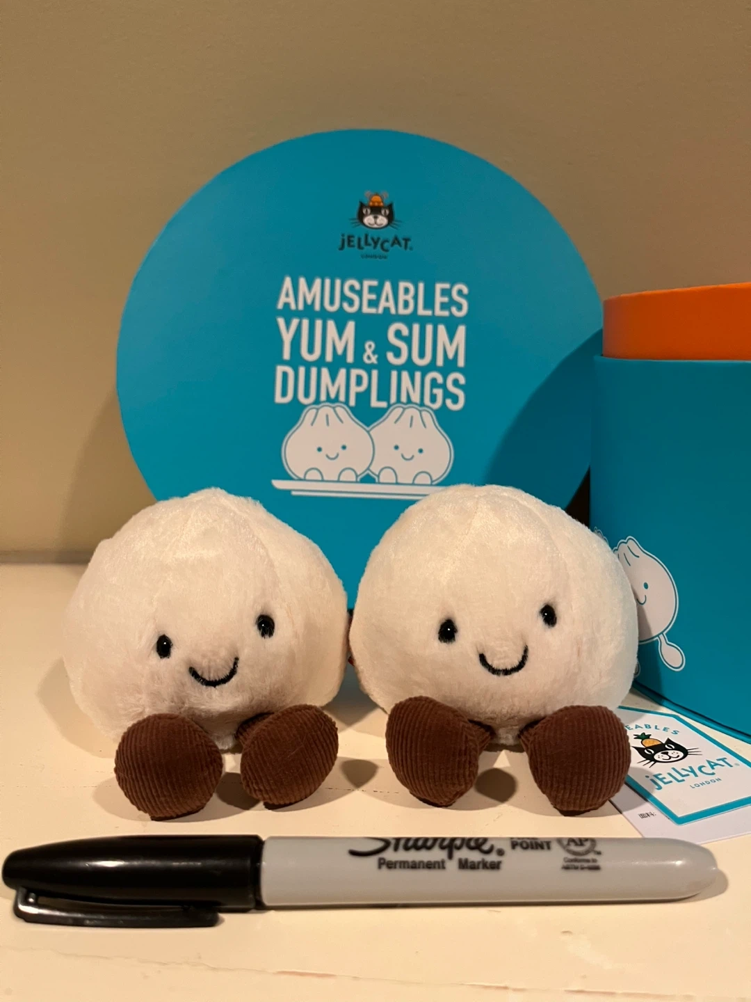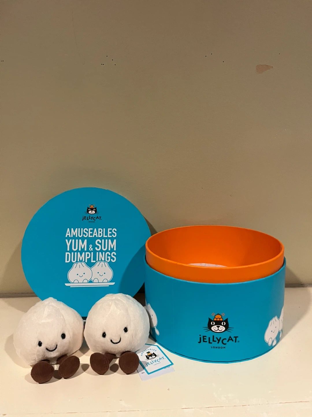 These adorable Jellycat Amuseables Yum & Sum Dumplings come in a round gift box. They're super soft and have cute corduroy feet!