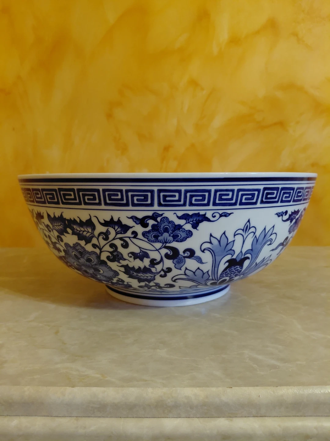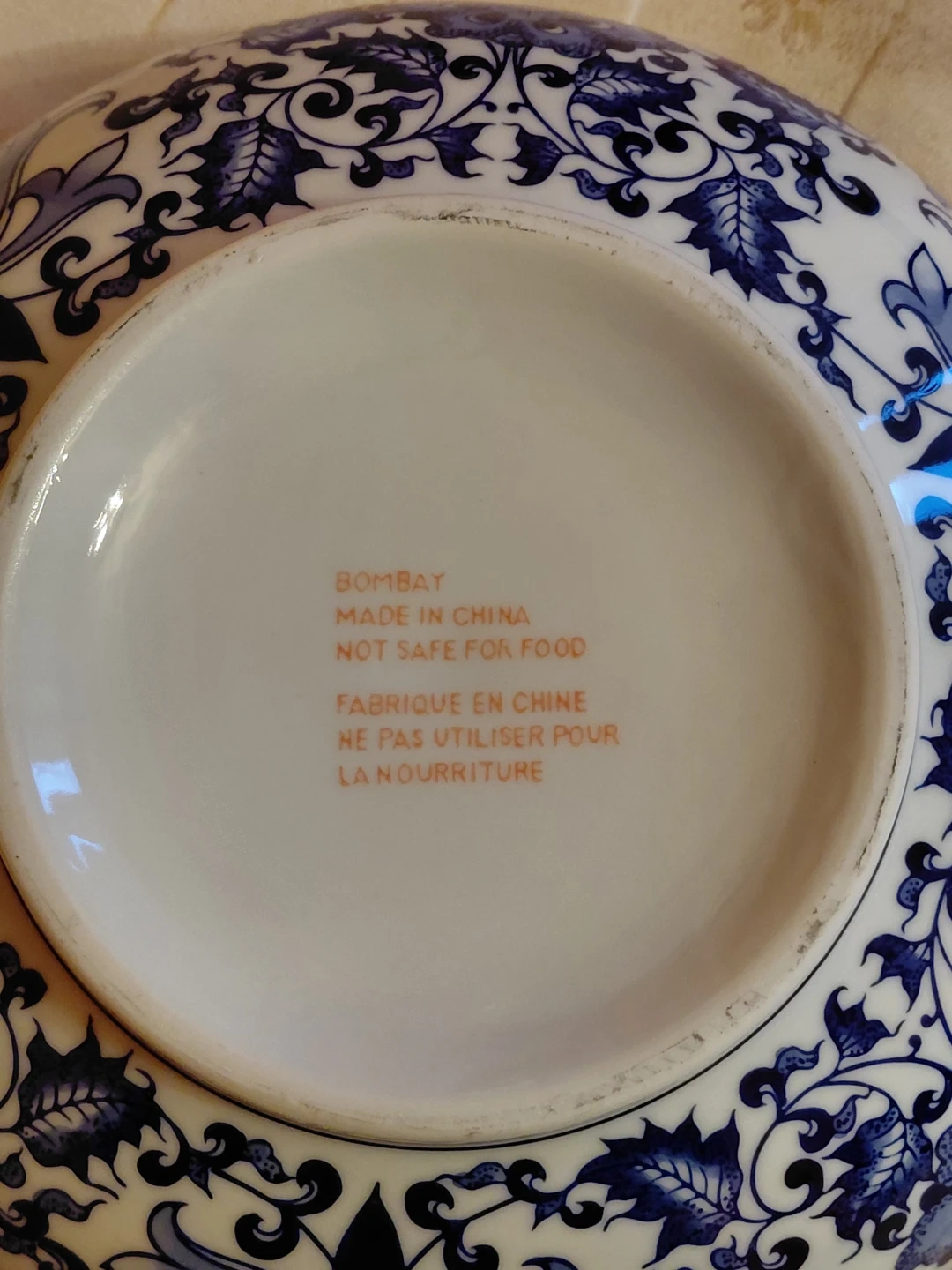 Bombay decorative bowl with blue and white floral pattern. This bowl is made in China and is not safe for food use. It's a beautiful piece for display.