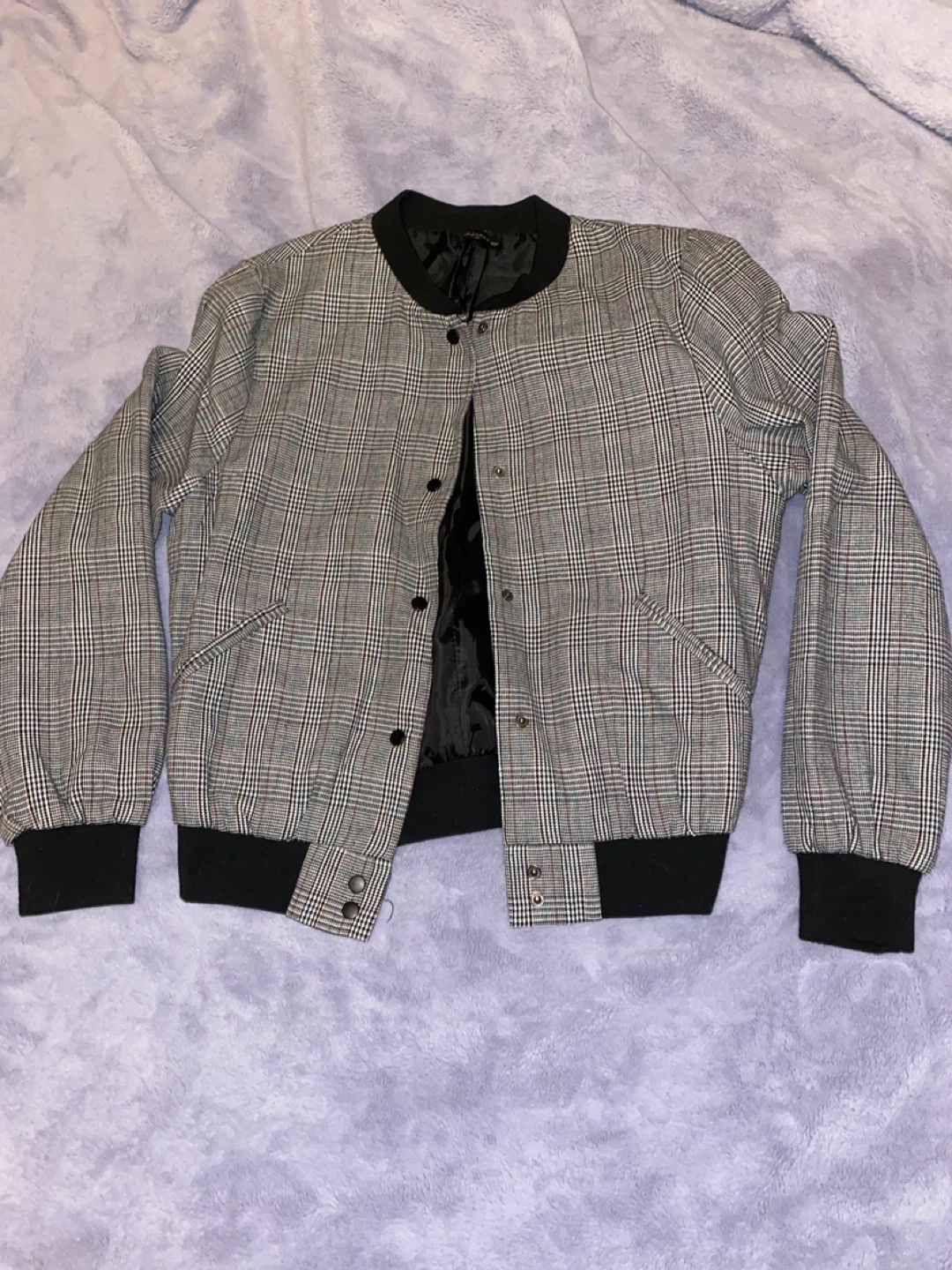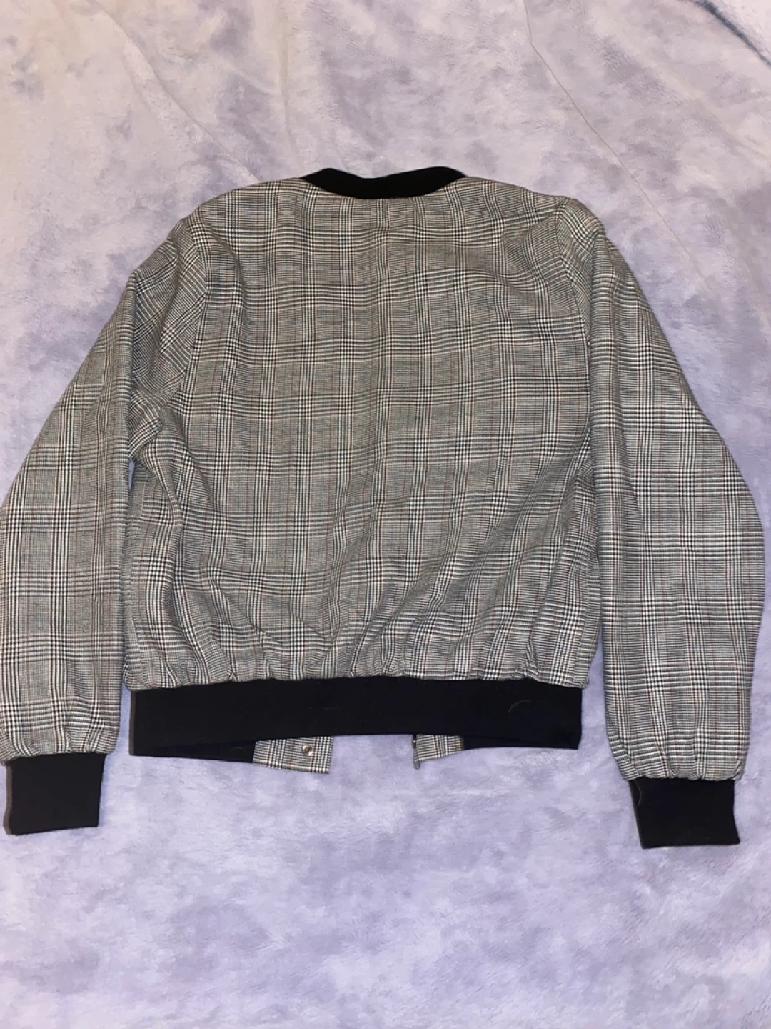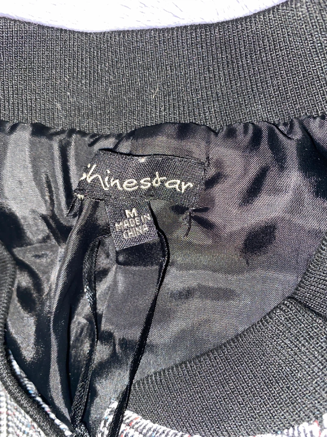 This Shinestar bomber jacket features a classic plaid pattern. It's a size medium with a black lining and ribbed cuffs and collar. This jacket is great for layering in cooler weather!