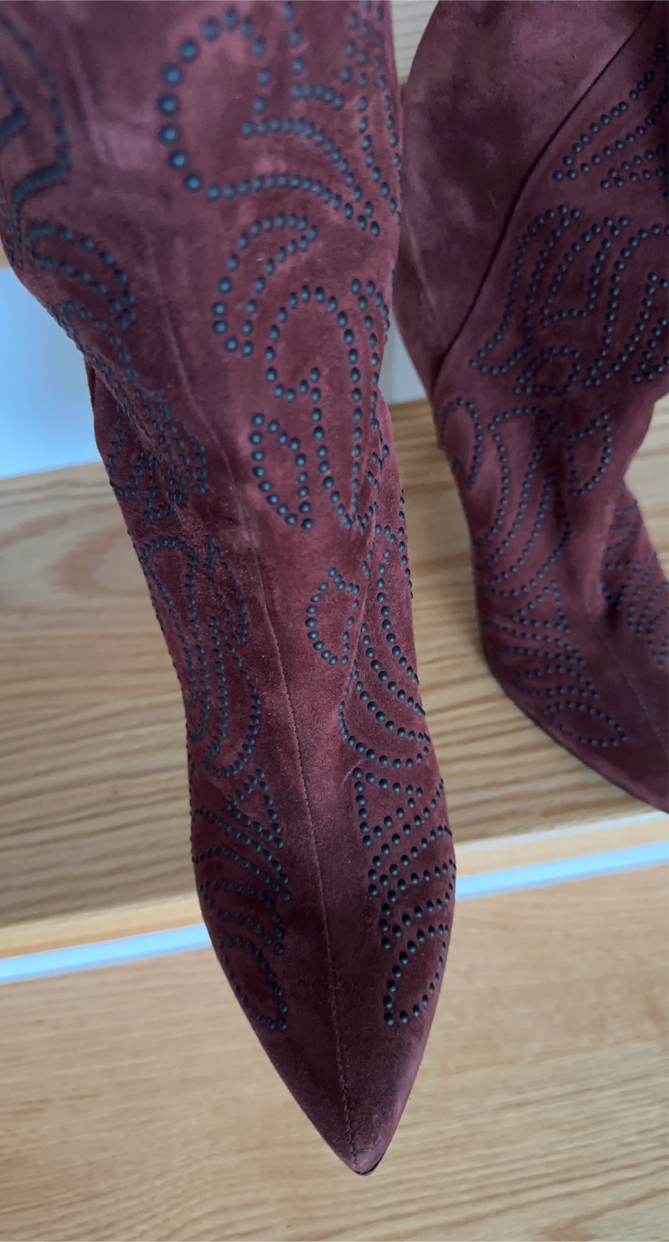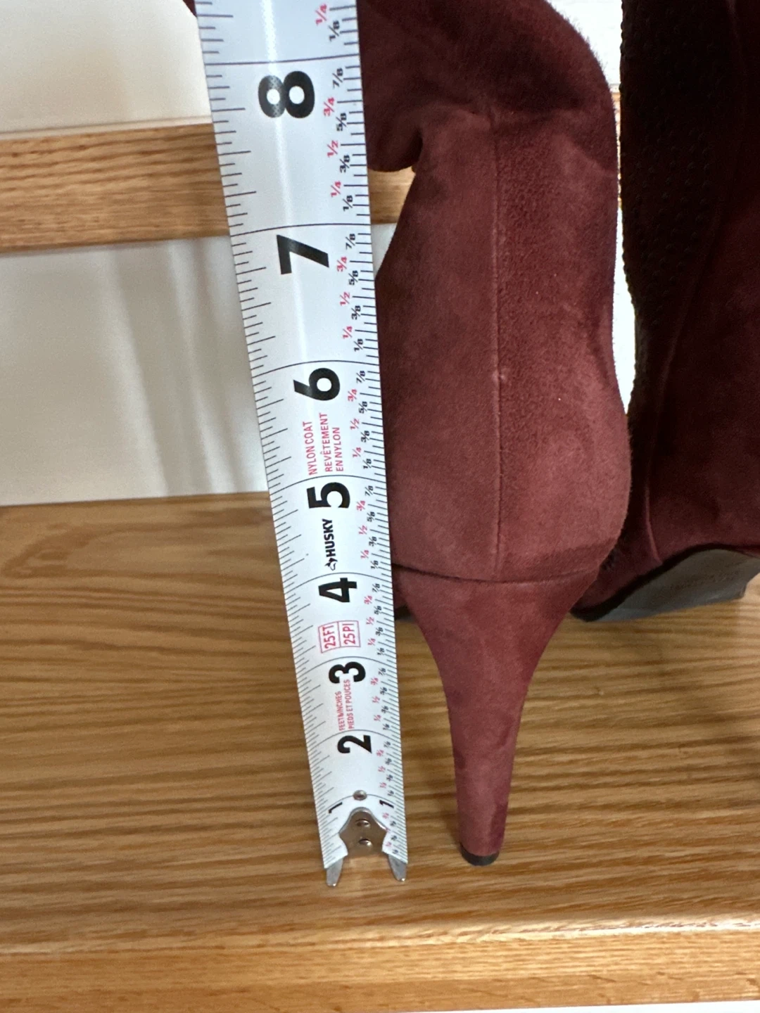 These stylish burgundy suede ankle boots are from NOW. They're made in Italy and feature decorative stud detailing. The heel height is approximately 4 inches.