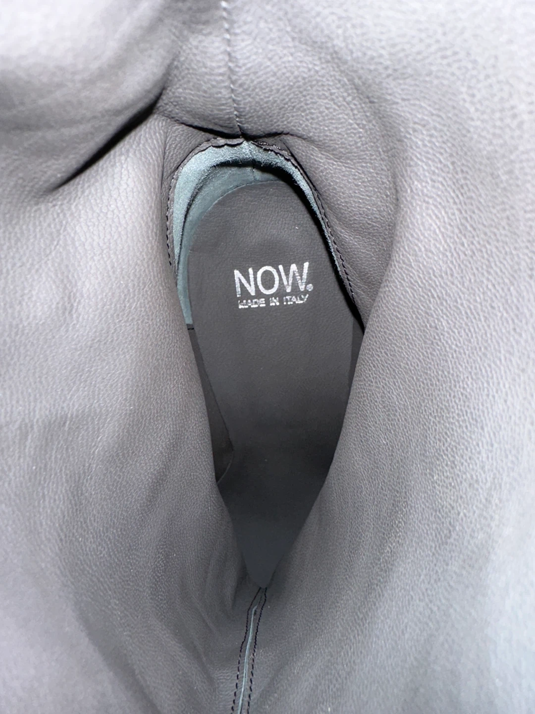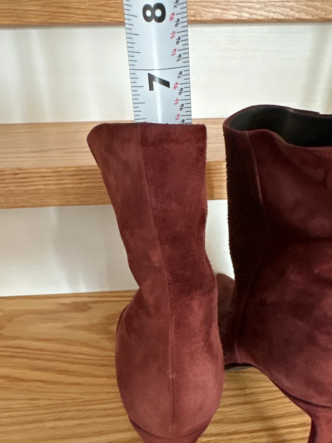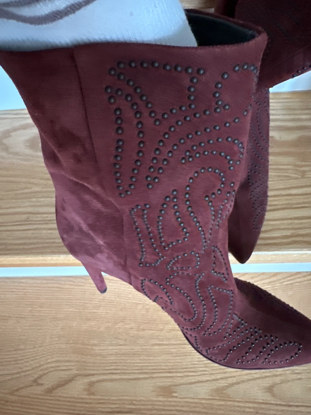 These stylish burgundy suede ankle boots are from NOW. They're made in Italy and feature decorative stud detailing. The heel height is approximately 4 inches.
