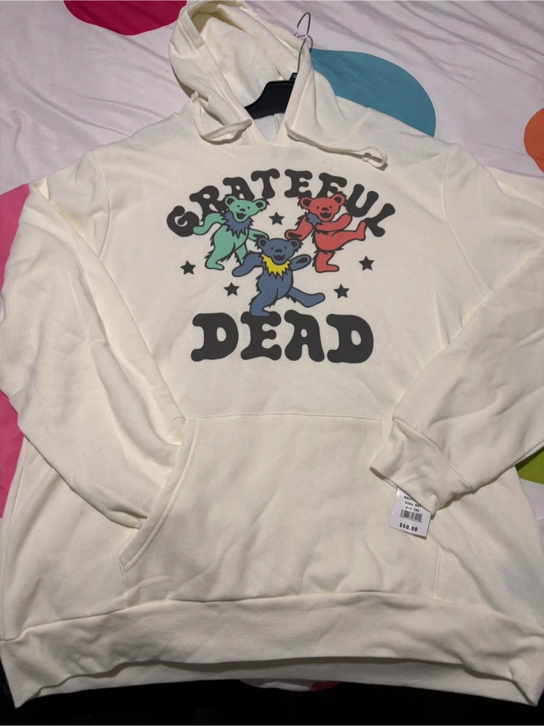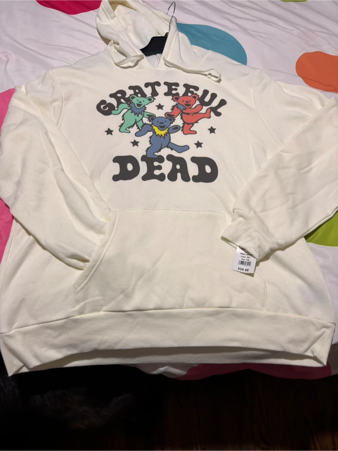 Selling a Grateful Dead hoodie in cream color! BRAND NEW and features the iconic dancing bears design. Size 2XL. Perfect for any Deadhead! UNISEX