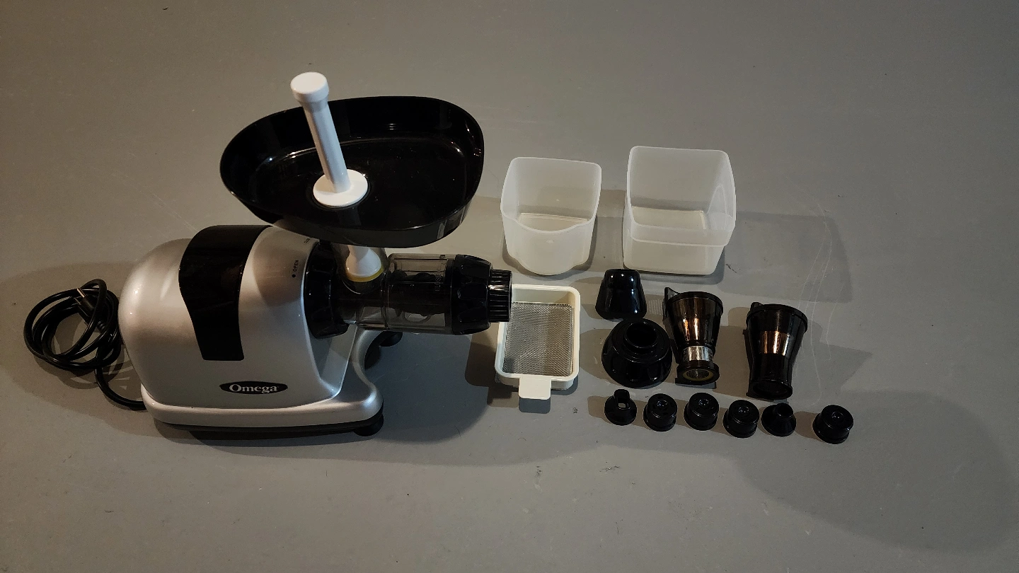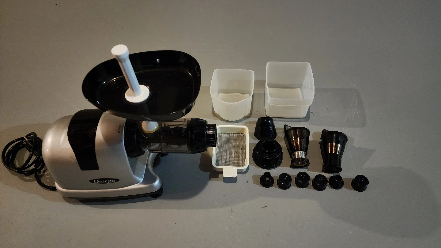 Omega brand juicer. Silver and black. Includes all parts and accessories. Great for making fresh juice.