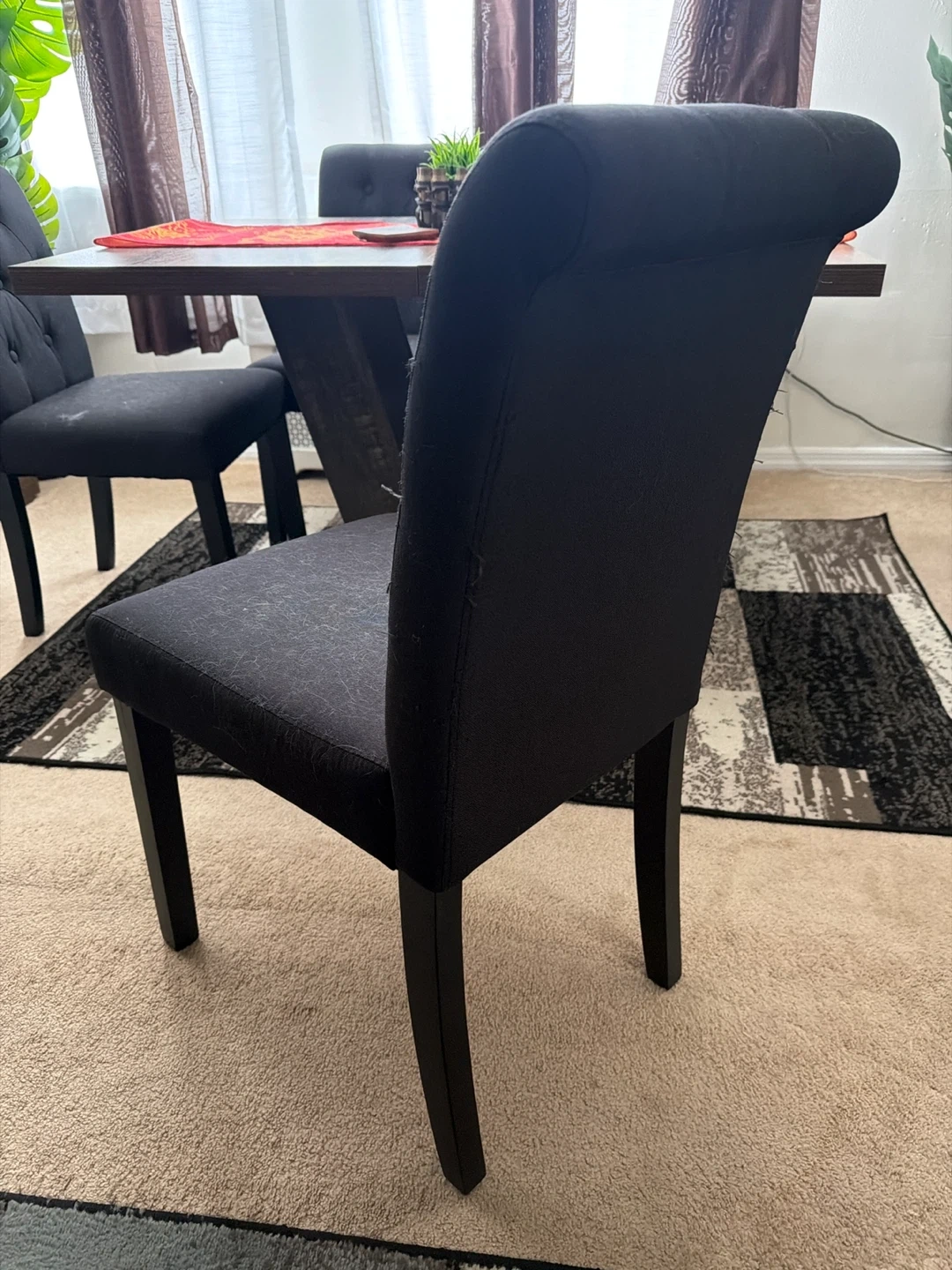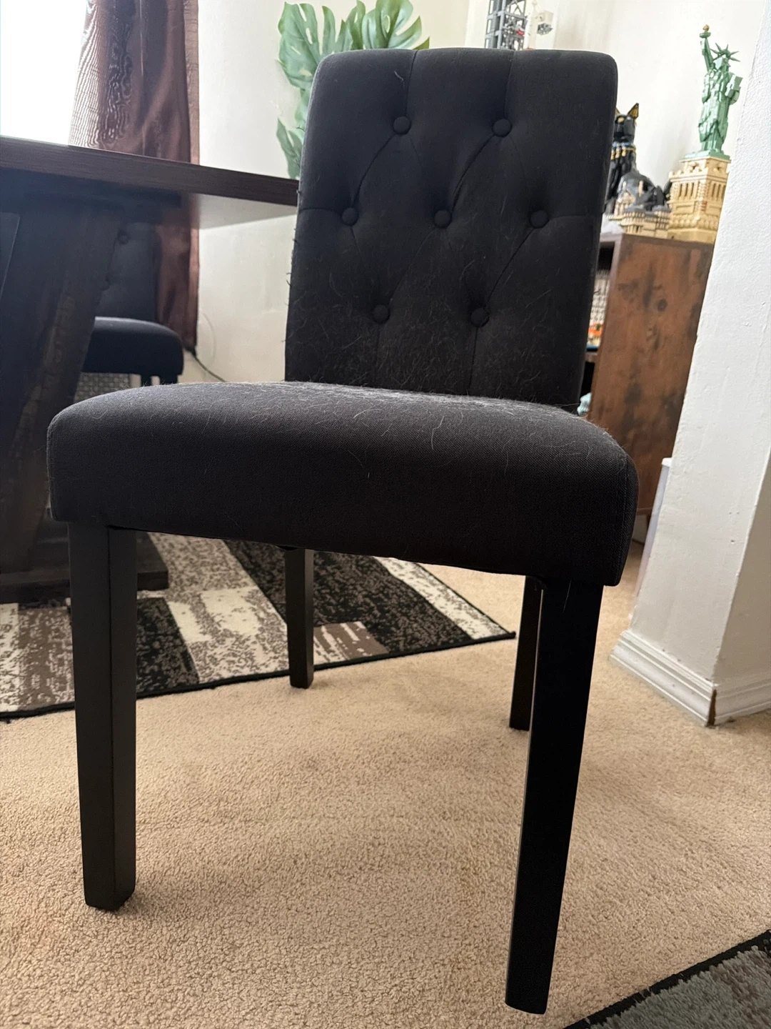 This is a black upholstered dining chair with a tufted backrest. It features wooden legs and a comfortable seat cushion. The fabric appears to be a textured material. The way are preloved. I have two cats that have enjoyed them more than me. Need work done.
