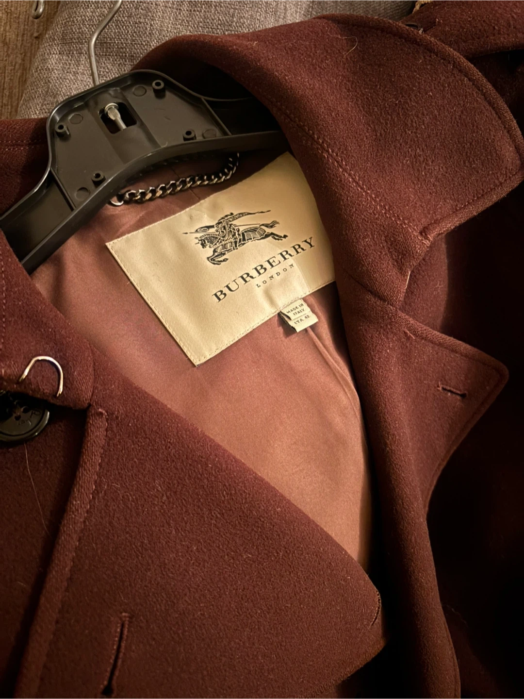 Burberry London trench coat in a deep plum colour. Double-breasted front with a belted waist. Made in Italy. Wool cashmere blend. Size 42 Italian (size 6)