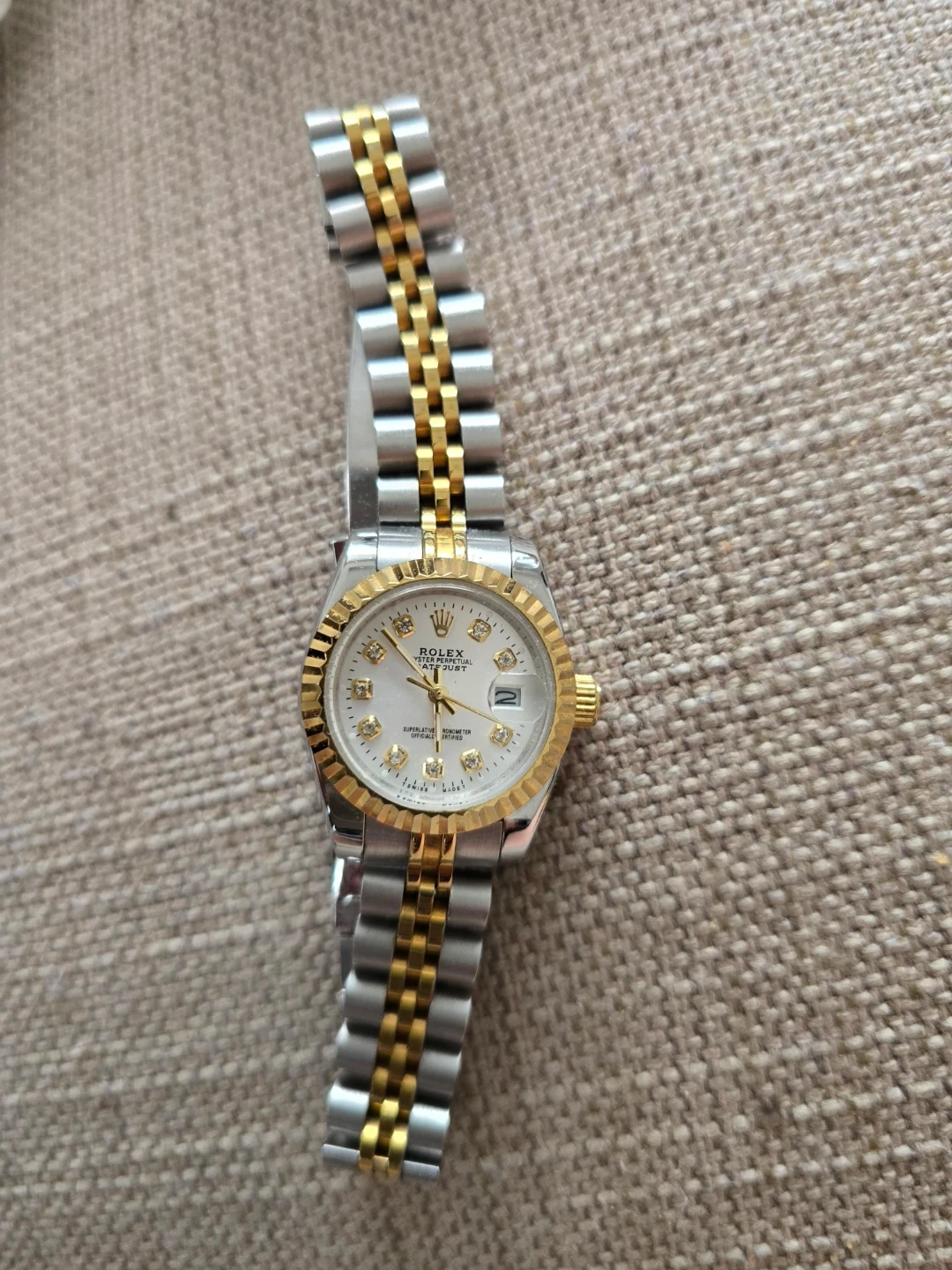 This is a classic Oyster Perpetual Datejust watch. It features a two-tone stainless steel and gold band with a white dial. The watch face has diamond hour markers and a date window.