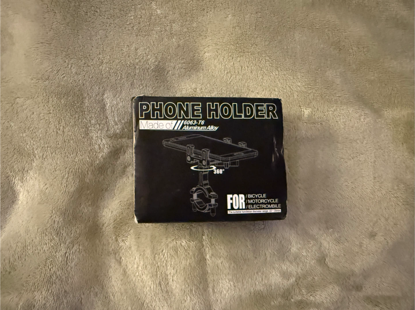 Selling a phone holder made of 6063-T6 Aluminum Alloy. It's designed for bicycles, motorcycles, and electromobiles. The holder has a 360° rotation feature for optimal viewing. The suitable handlebar diameter range is 22-35mm