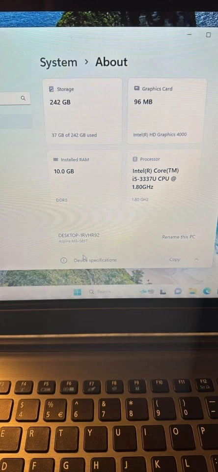 Acer Aspire M5-581T laptop with Intel i5-3317U 1.7GHz processor, 10GB RAM, and 256GB SSD. Comes with Windows 11 and Microsoft Office installed. Features a backlit keyboard and a good battery. Charger is included.