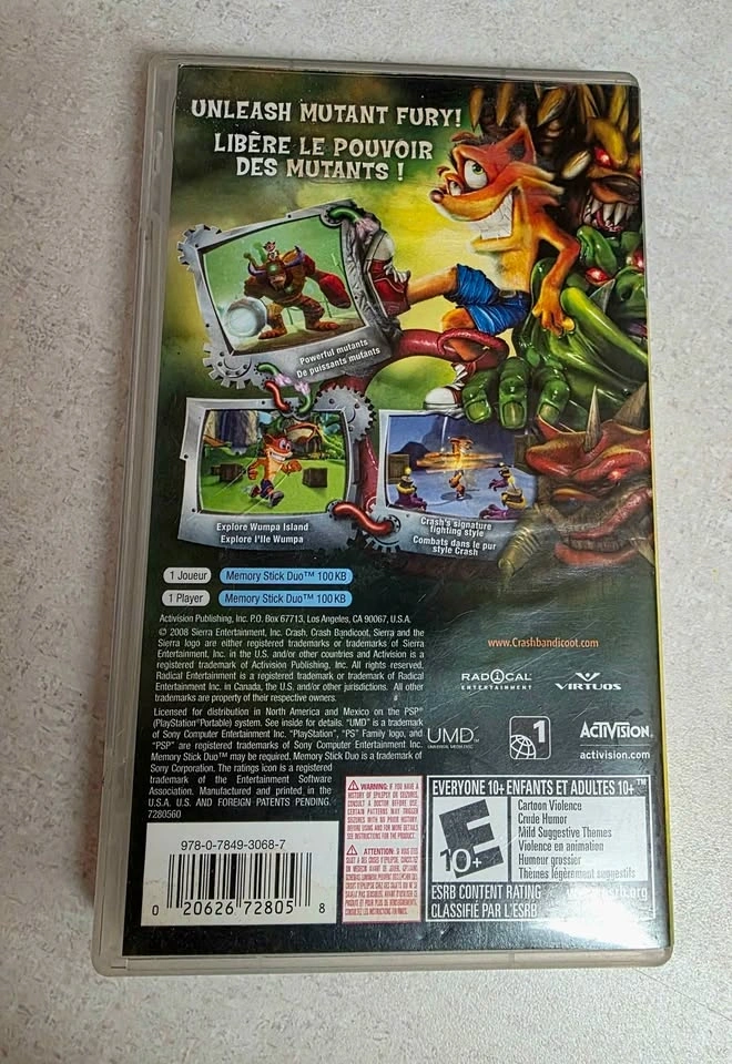 This is a complete copy of Crash: Mind Over Mutant for the Sony PlayStation Portable. It comes with the original case and game. The case has some light normal wear, but it's a fantastic, super fun platformer to add to your handheld collection!