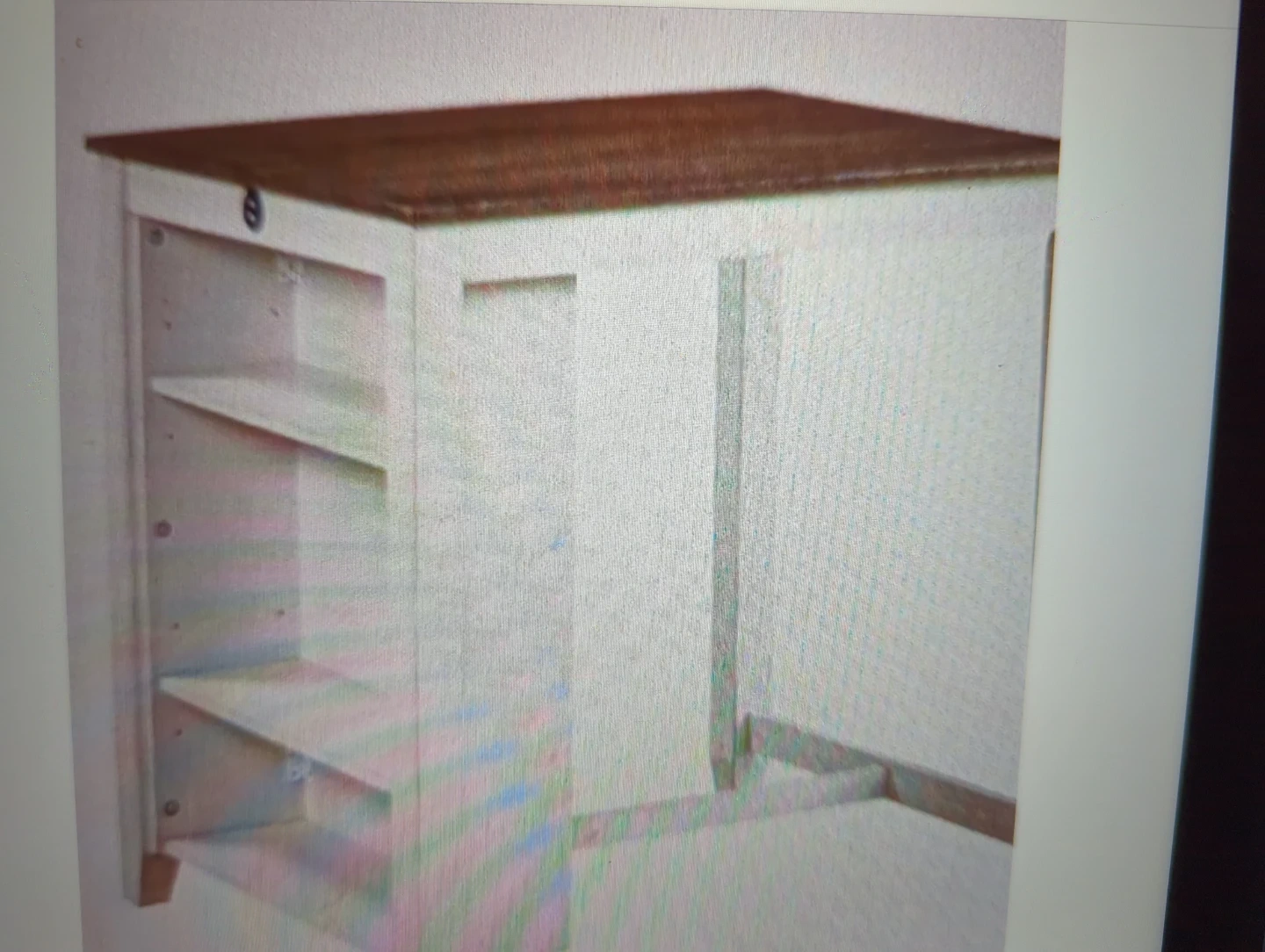 This side table has a white base with a wooden top. It features three open shelves on one side and a closed compartment on the other. Its compact design makes it handy for smaller spaces.