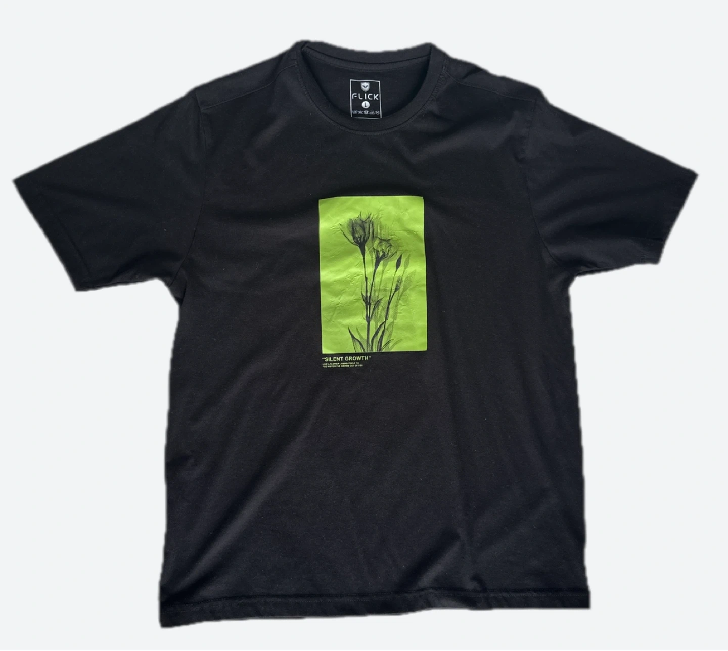 This is a black Flick t-shirt with a green "Silent Growth" graphic. It's size large. Made of cotton.