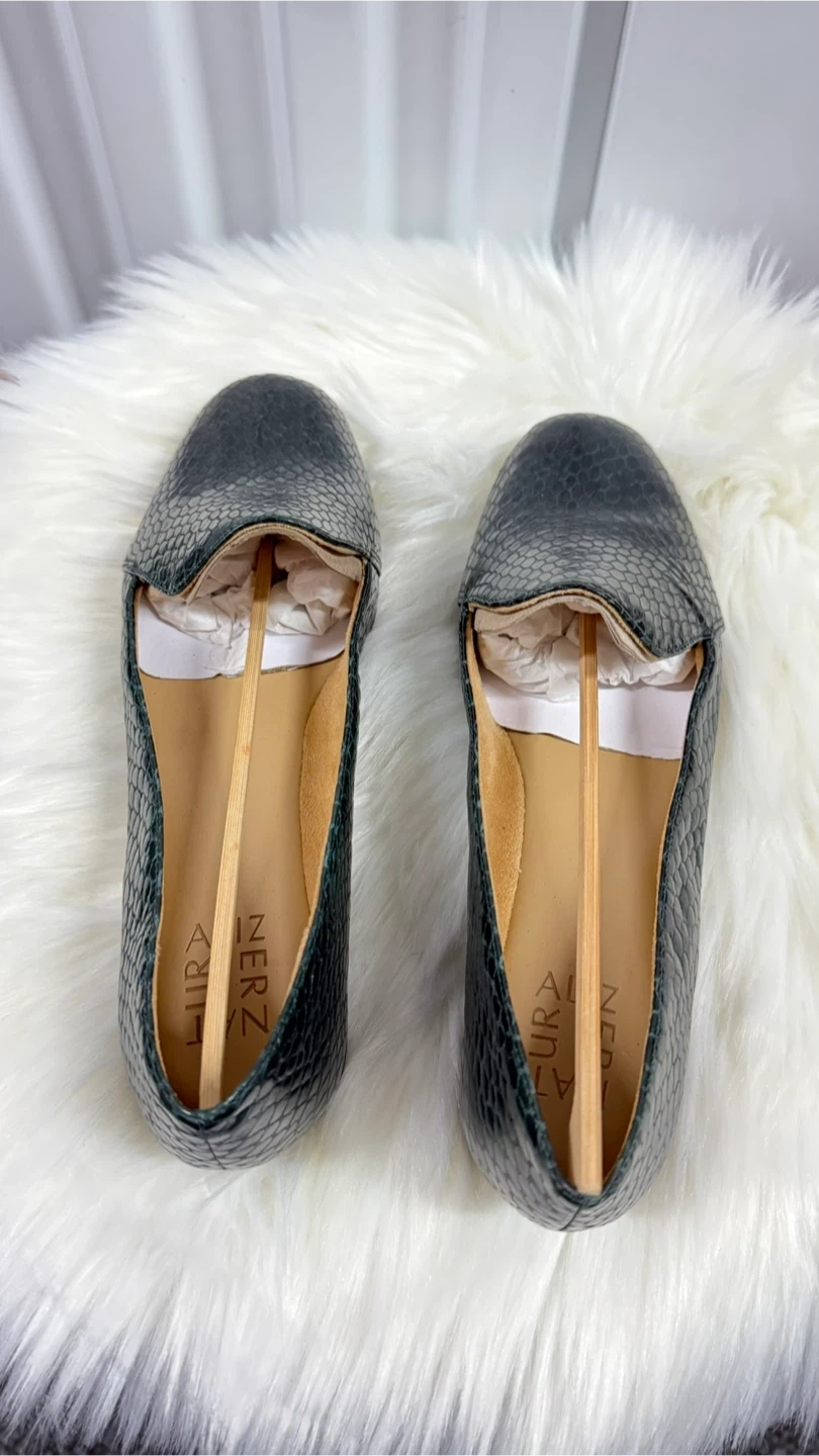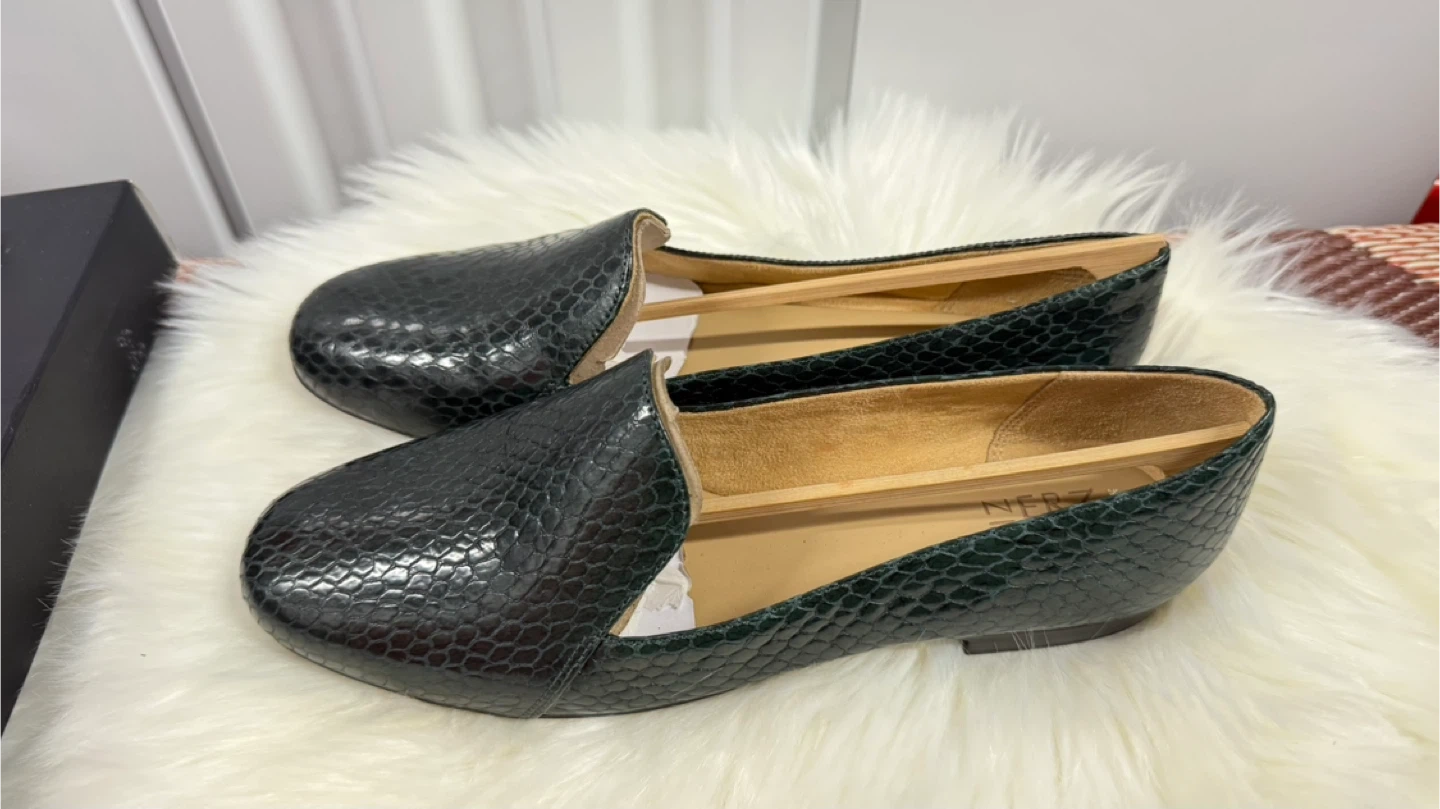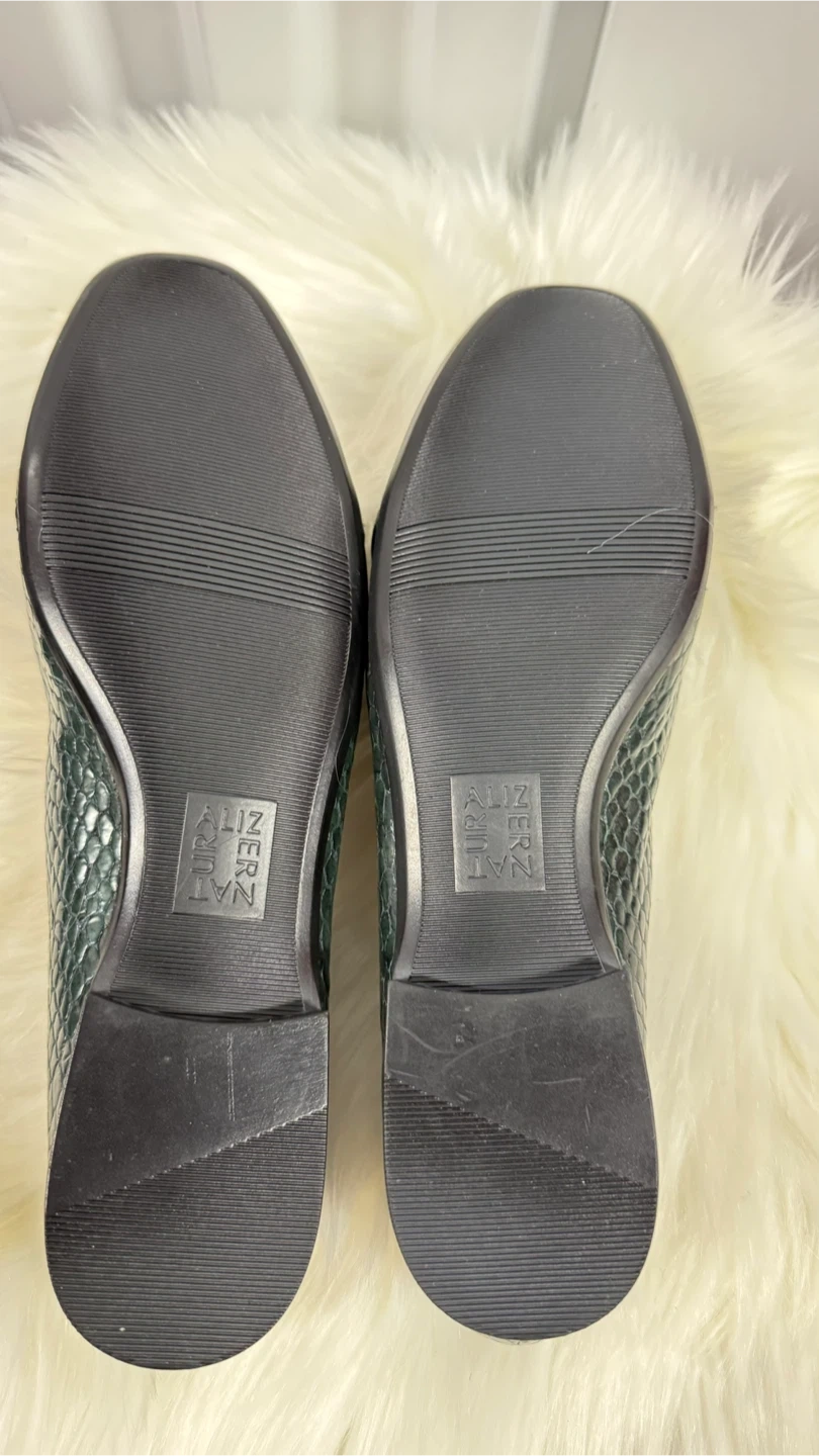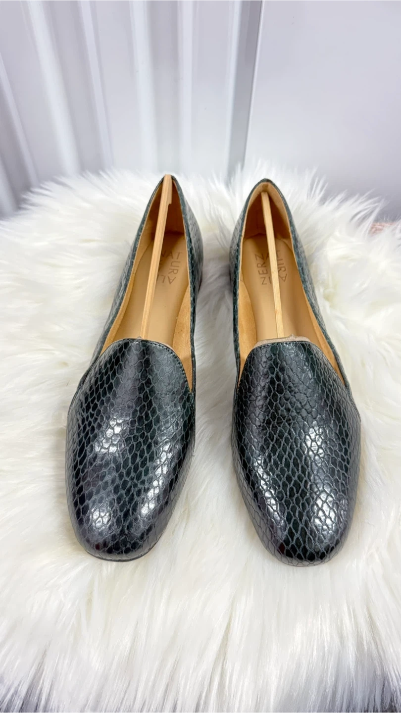These Naturalizer Emiline loafers feature a dark green, embossed reptile print. They are a women's size 9.5 wide. The original box is included! Slip-on style.