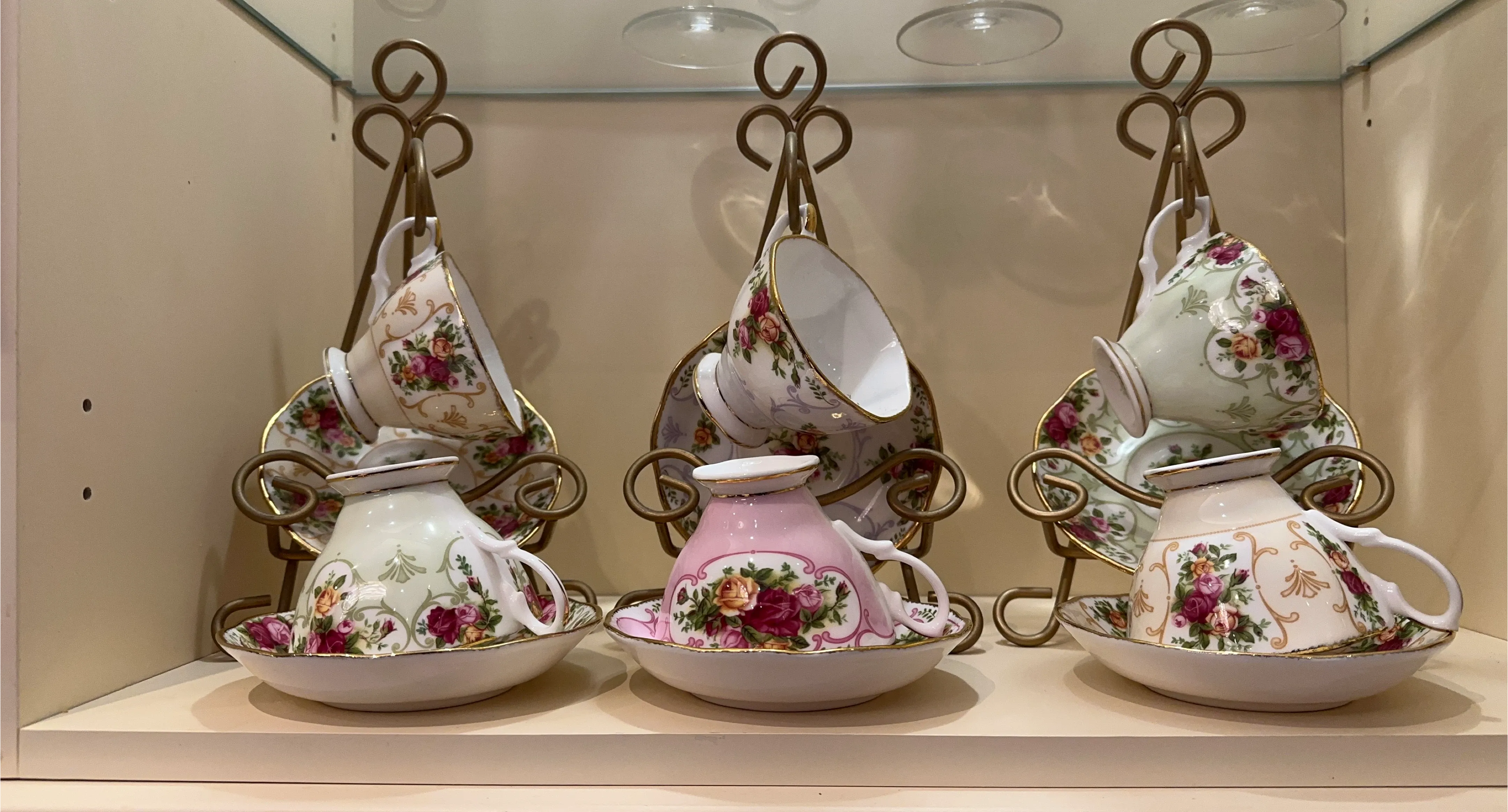 These are beautiful vintage teacups and saucers featuring a delicate rose pattern. They're made of fine porcelain with elegant gold trim. This set is perfect for enjoying afternoon tea or for display!