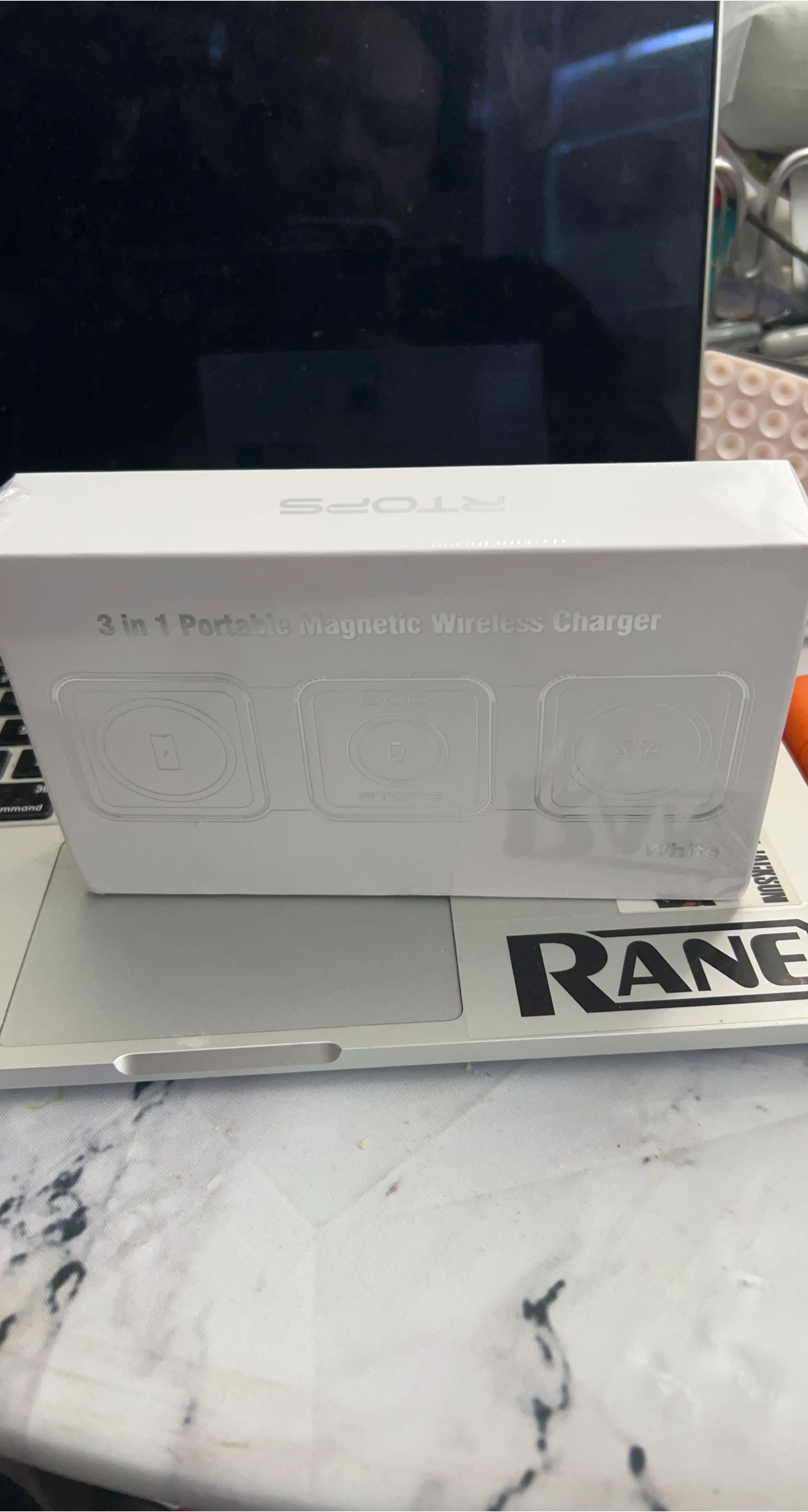This is a 3-in-1 portable magnetic wireless charger from RTOPRS. It's designed to charge multiple devices at once. It's white in colour.